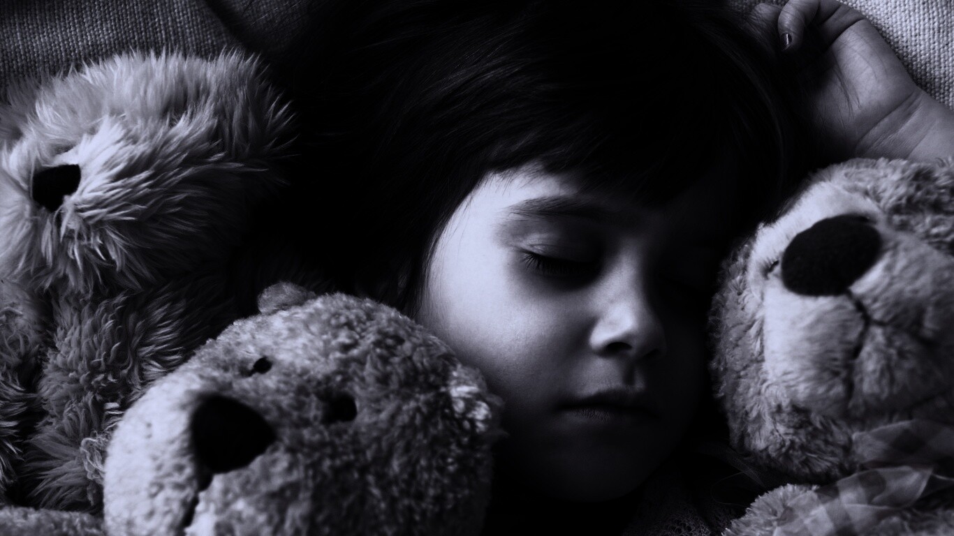 Обои для рабочего стола «Девочка спит с мишками в обнимку» 1366х768 с фильтром gotham (оригинал 2560х1600)
