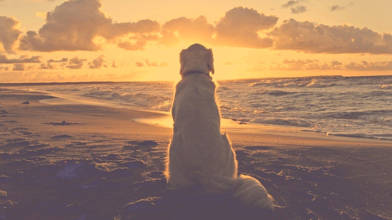 «Собака наблюдающая закат на пляже»