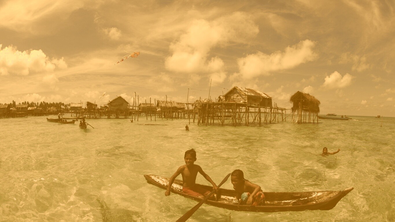 «Дети в лодке у поселения туземцев»