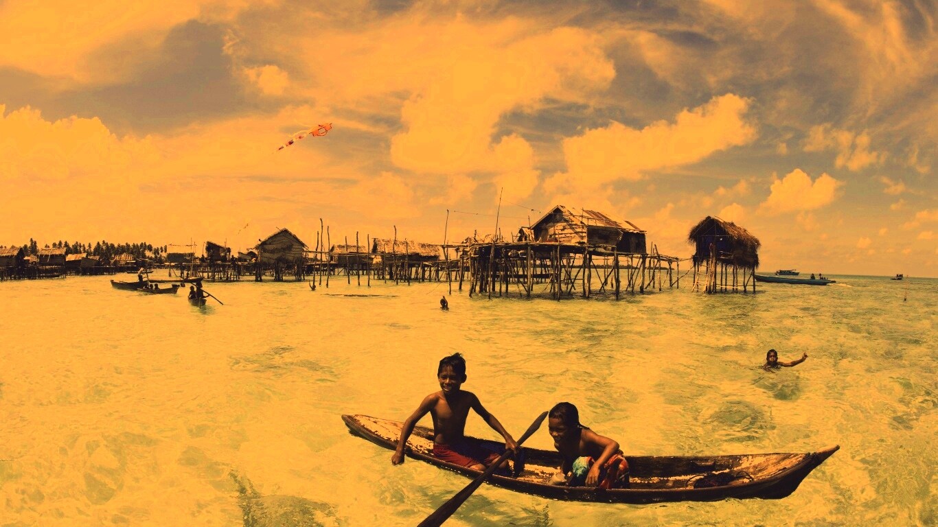 «Дети в лодке у поселения туземцев»