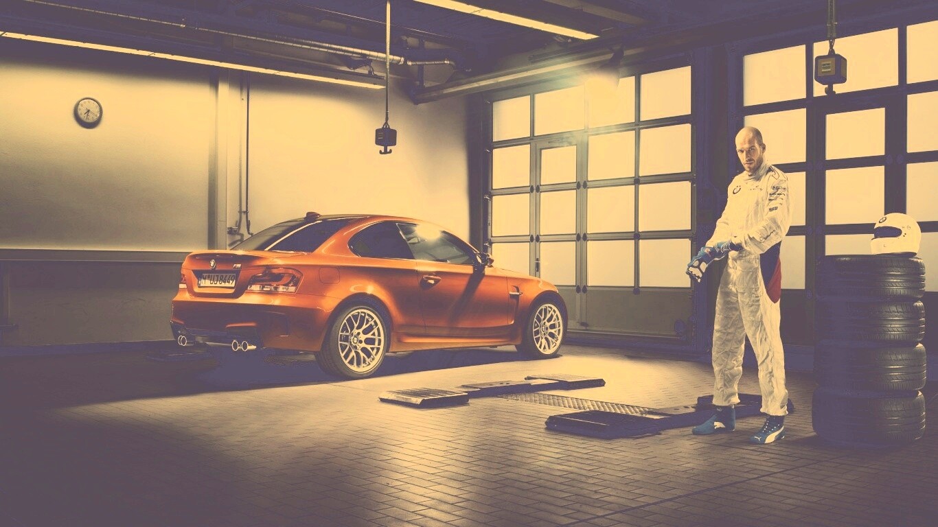 Обои для рабочего стола «Гонщик и BMW M1 в гараже» 1366х768 с фильтром nashville (оригинал 1920х1200)