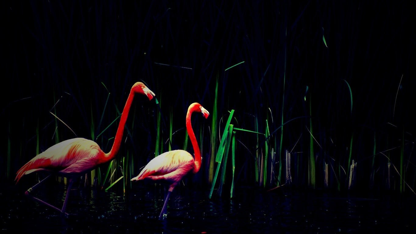 Обои для рабочего стола «Красивые розовые фламинго на озере» 1366х768 с фильтром lomo (оригинал 2560х1600)