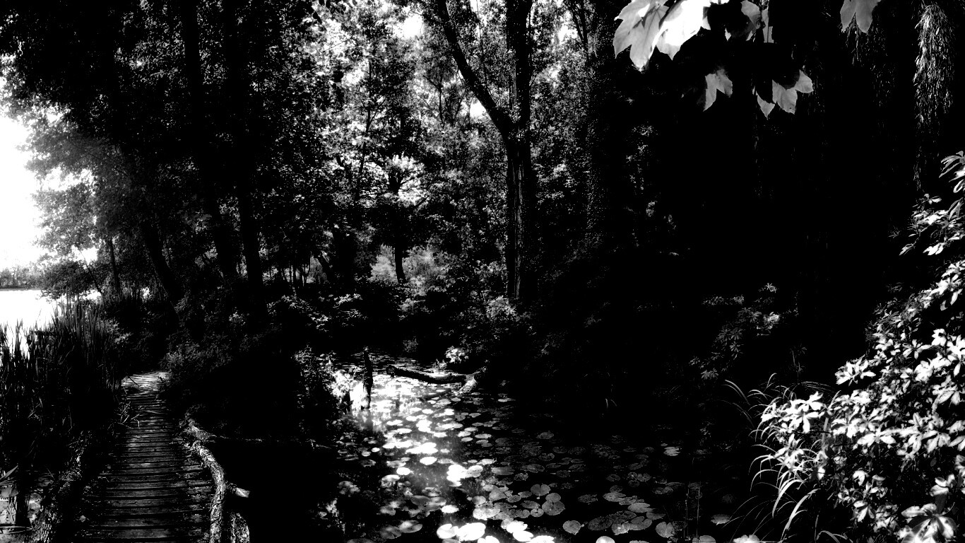 Обои для рабочего стола «Пруд в лесу» 1366х768 с фильтром inkwell (оригинал 1920х1200)