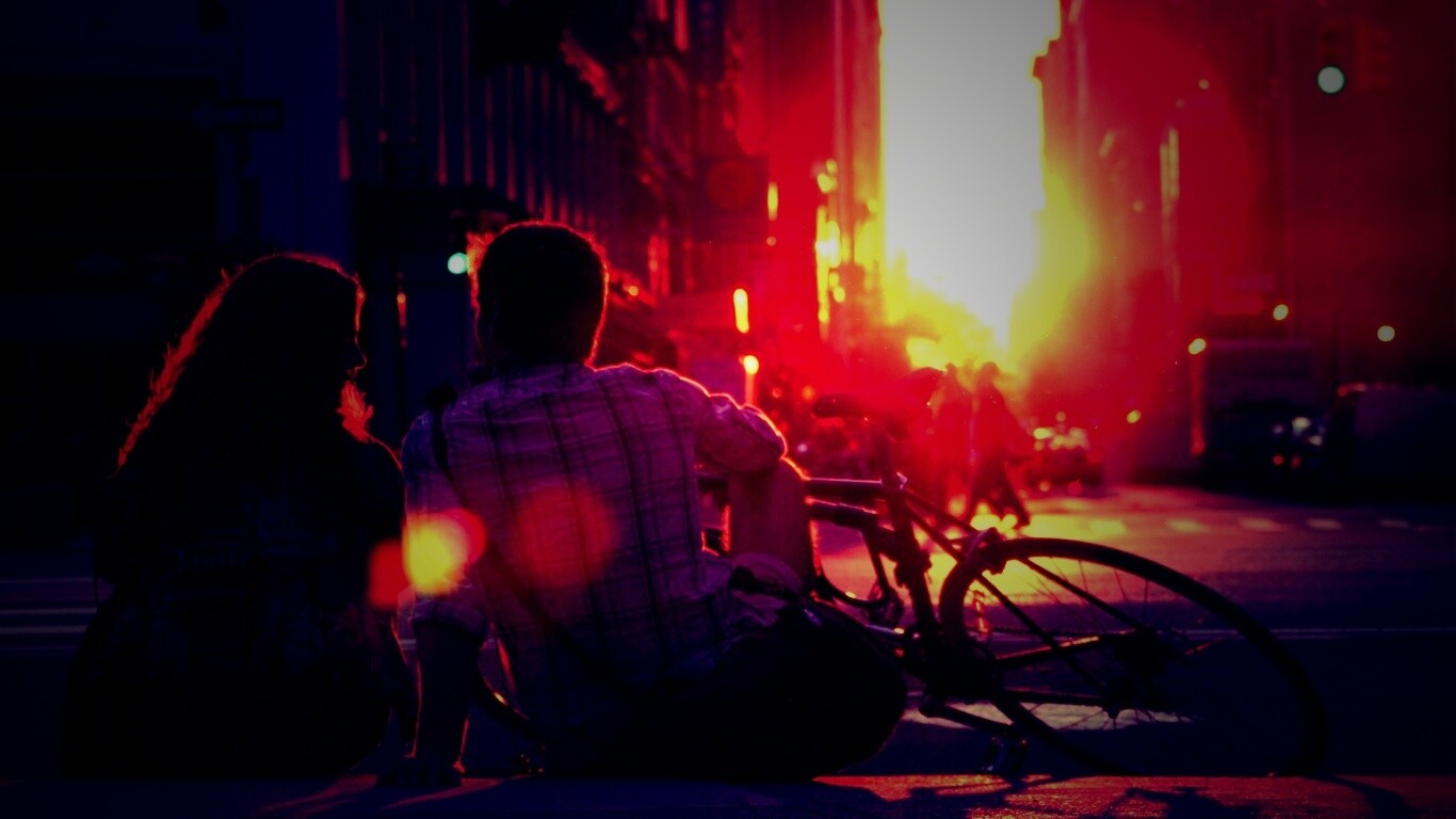 «Девушка и парень с велосипедом на закате»
