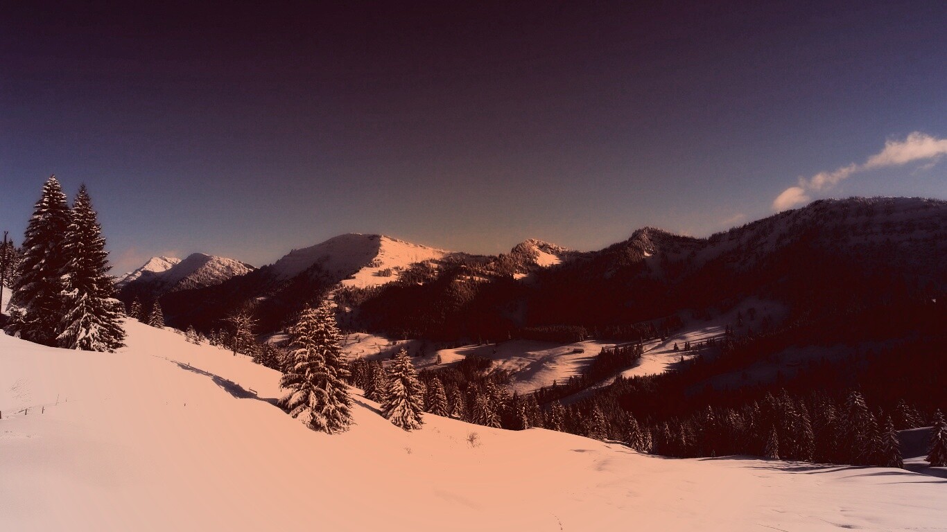 Обои для рабочего стола «Лес в горах» 1366х768 с фильтром toaster (оригинал 2560х1600)
