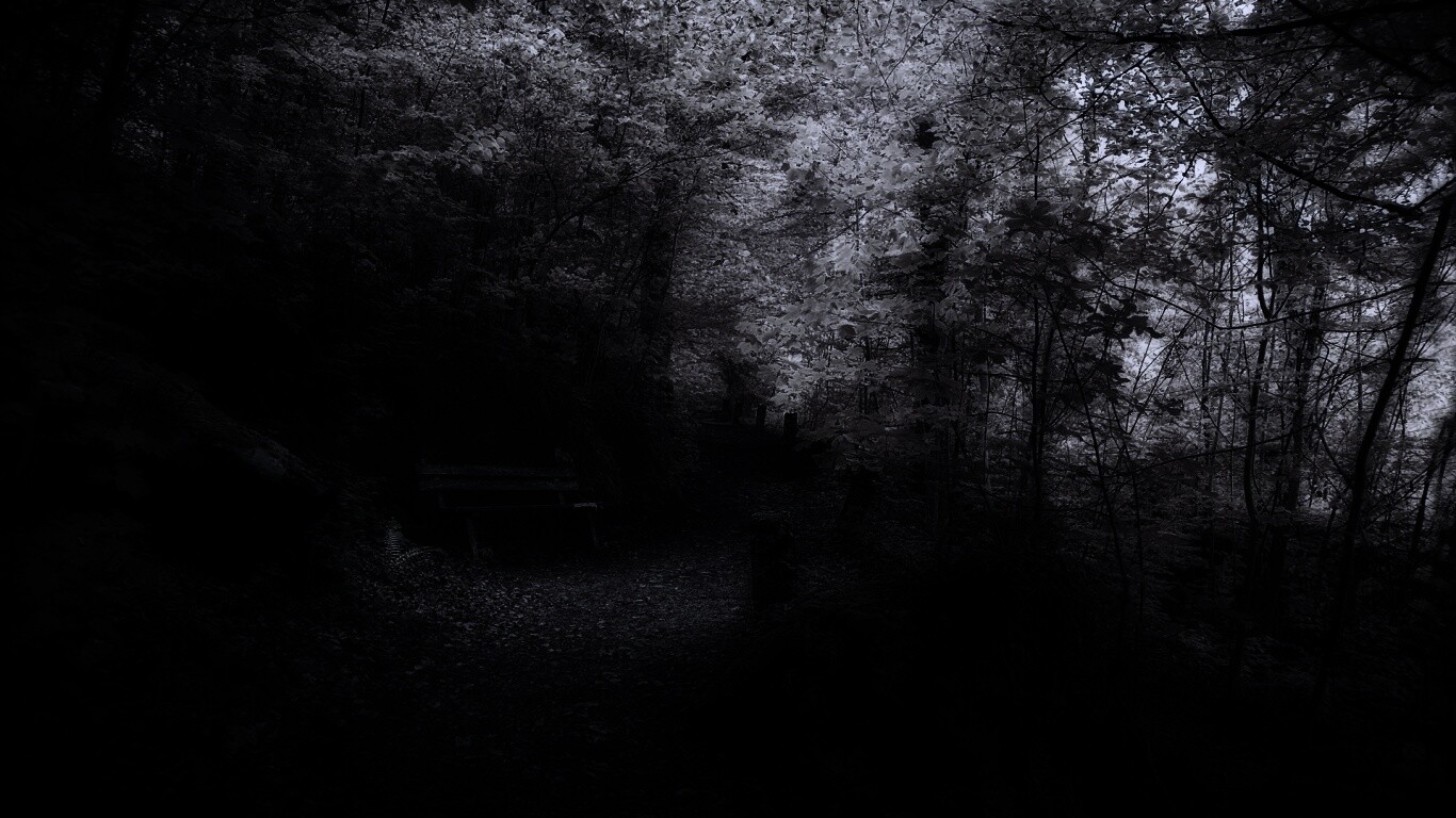 Обои для рабочего стола «Скамейке в чаще парка» 1366х768 с фильтром gotham (оригинал 1920х1200)