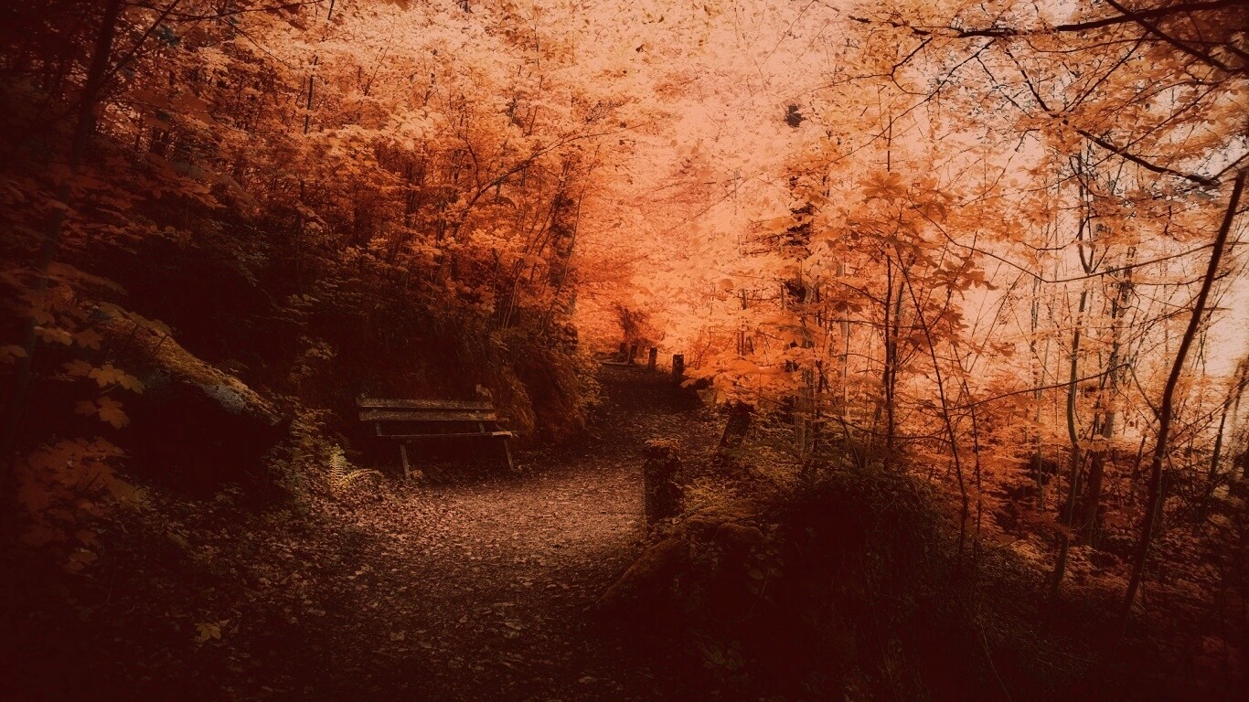 Обои для рабочего стола «Скамейке в чаще парка» 1366х768 с фильтром toaster (оригинал 1920х1200)