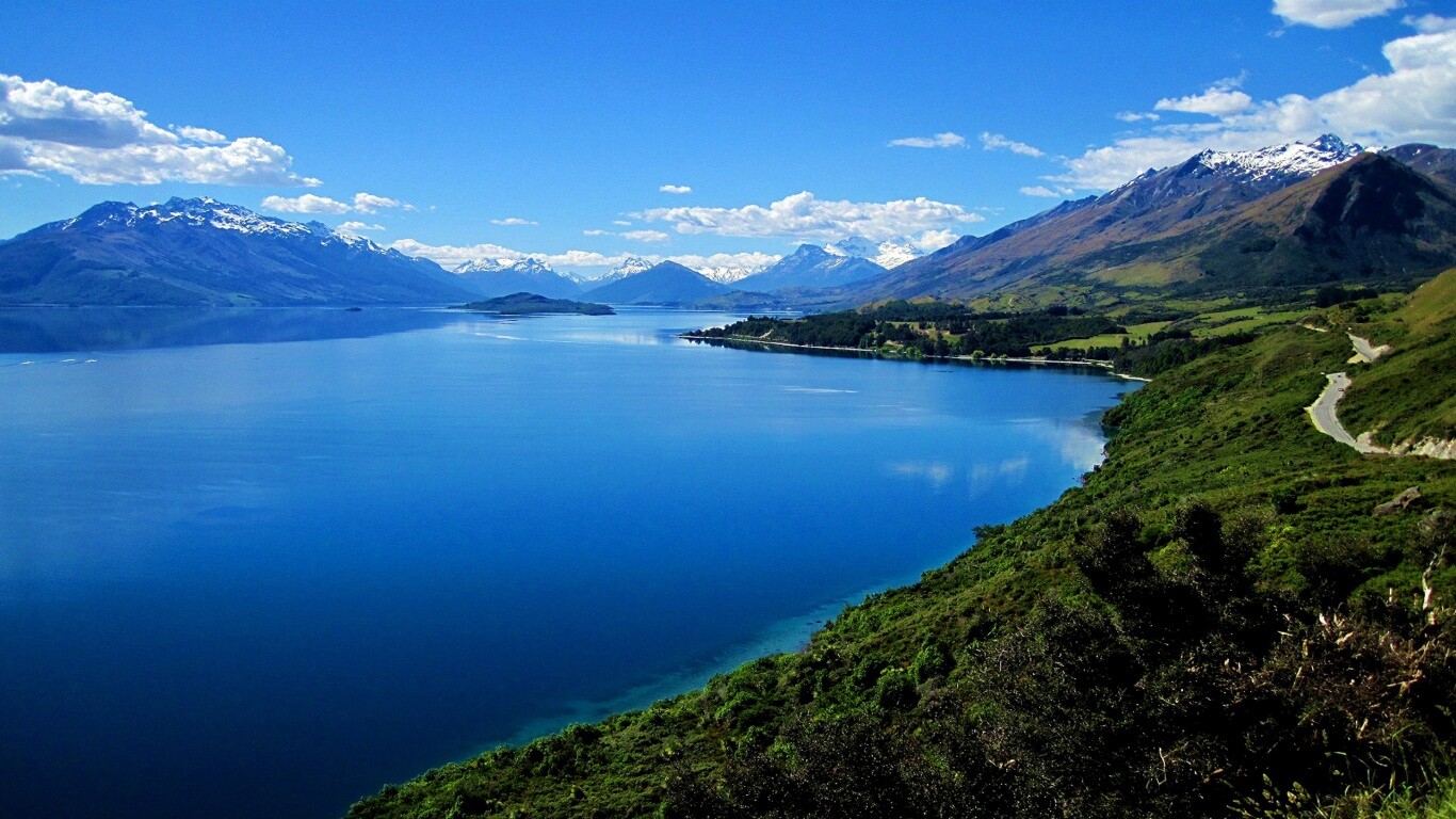 Обои для рабочего стола «Горное озеро» 1366х768 с фильтром vibrance (оригинал 2560х1600)