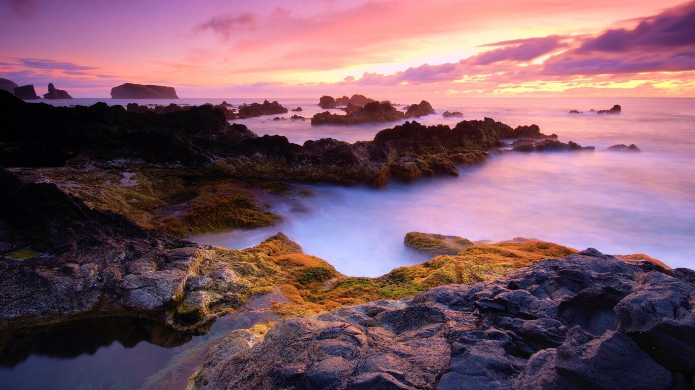 Обои для рабочего стола «Острова в тумане» 1366х768 с фильтром vibrance (оригинал 1920х1200)