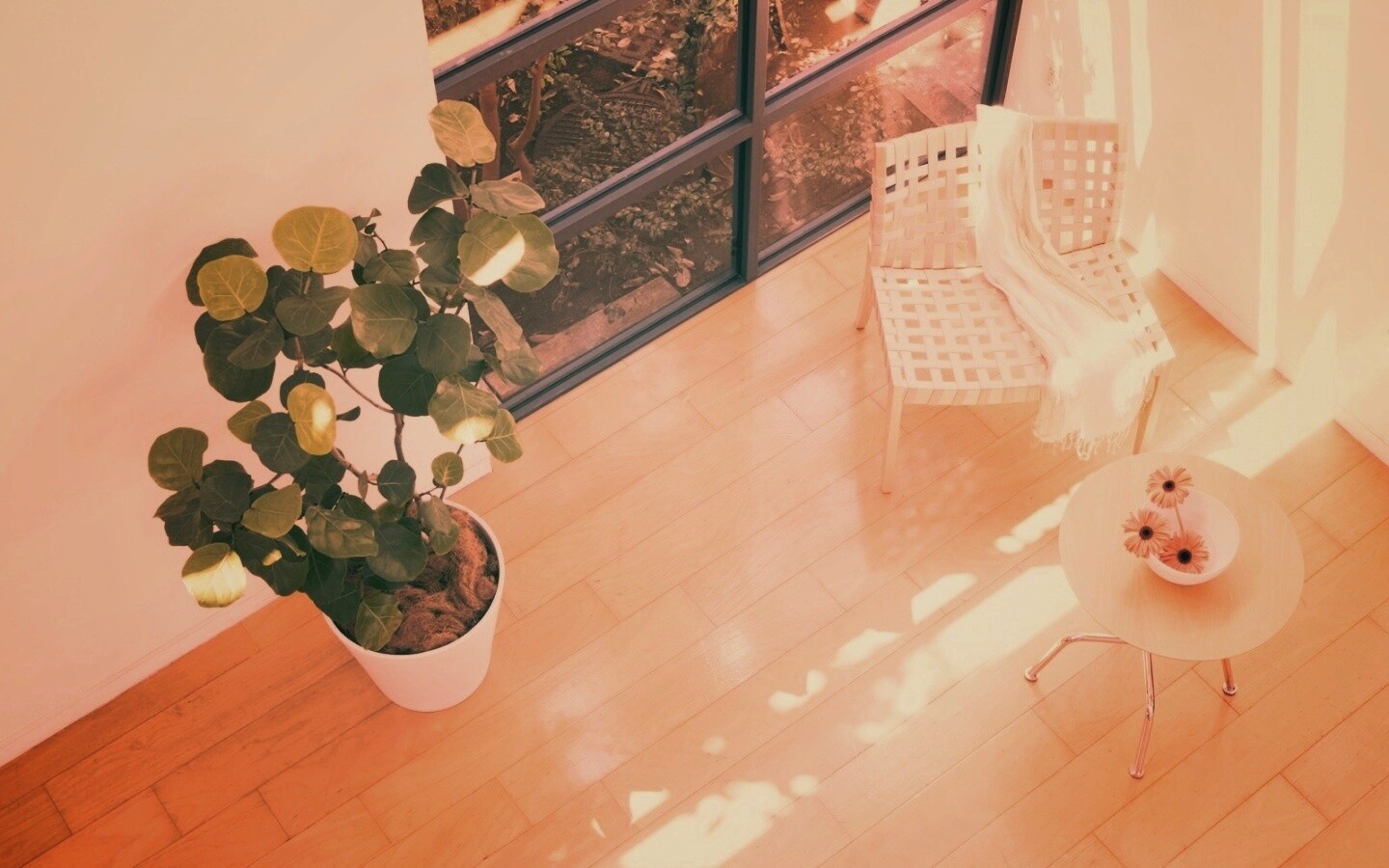 «Стул, столик и цветы в комнате»