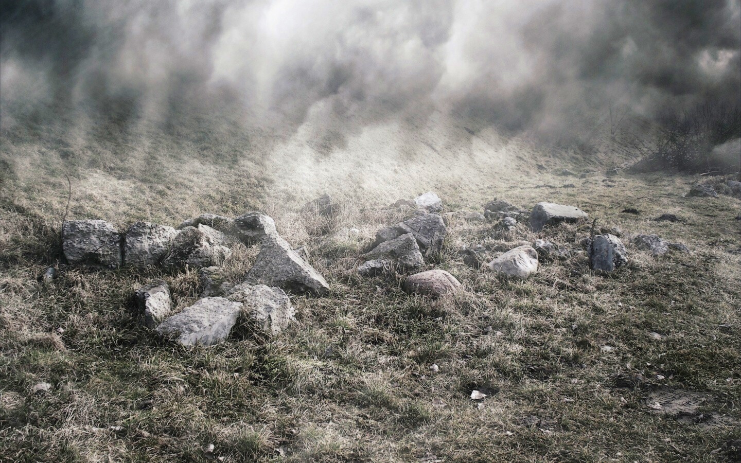 Обои для рабочего стола «Камни под туманом» 1440х900 с фильтром vibrance (оригинал 2560х2048)