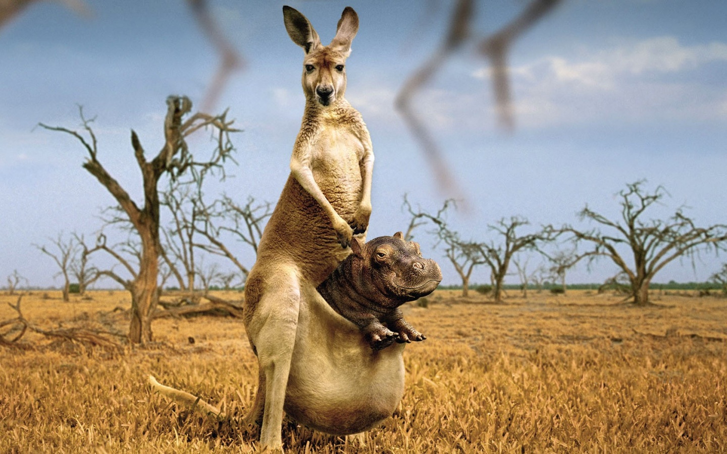 Обои для рабочего стола «Кенгуру с бегемотом в сумке» 1440х900 (оригинал 1680х1050)