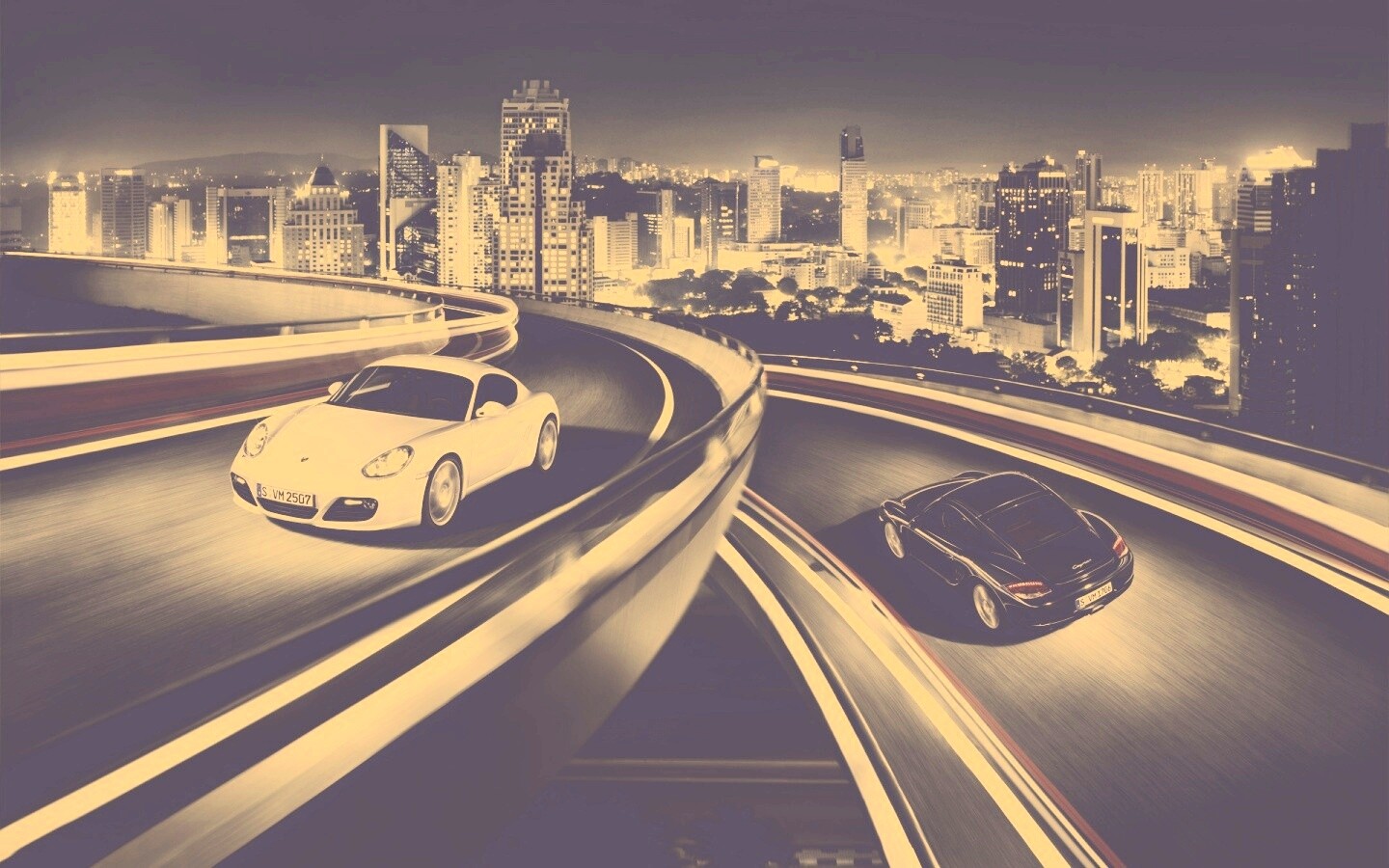 «Черный и белый Porsche на автомагистрале.»