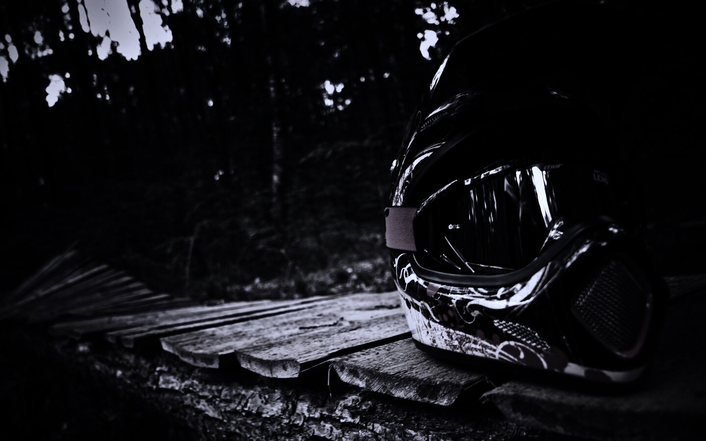 Обои для рабочего стола «Шлем на лесной велотрассе» 1440х900 с фильтром gotham (оригинал 3872х2592)