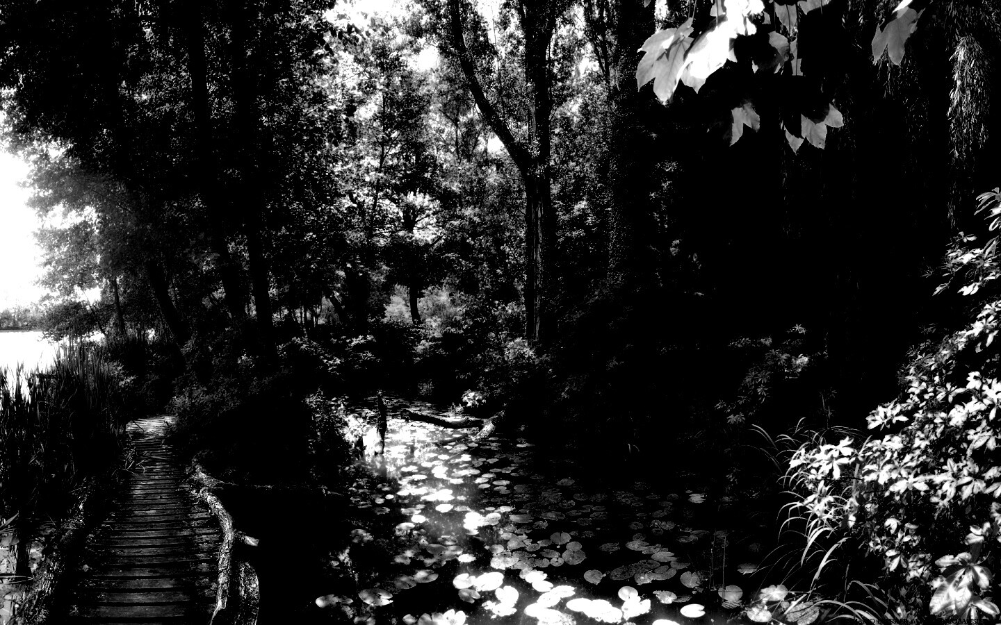 Обои для рабочего стола «Пруд в лесу» 1440х900 с фильтром inkwell (оригинал 1920х1200)