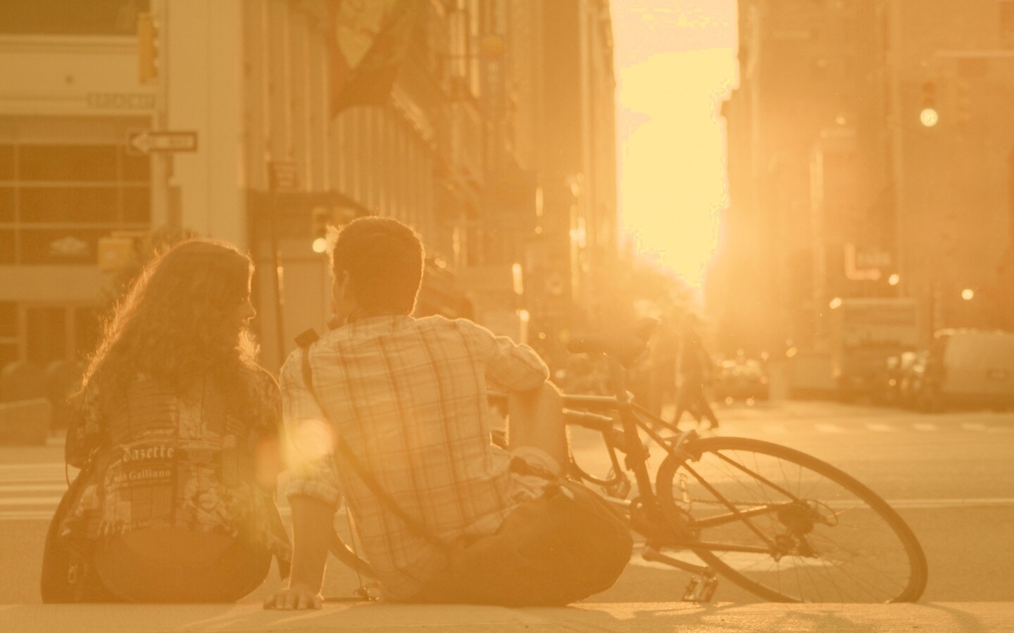 «Девушка и парень с велосипедом на закате»