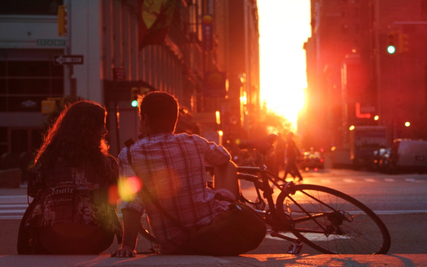 «Девушка и парень с велосипедом на закате»
