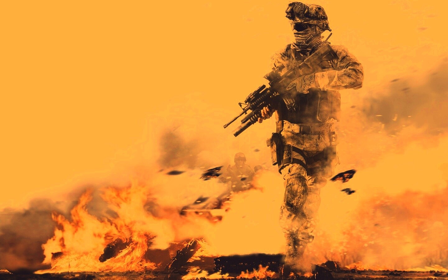 Обои для рабочего стола «Солдат на фоне огня» 1440х900 с фильтром nashville (оригинал 1920х1080)