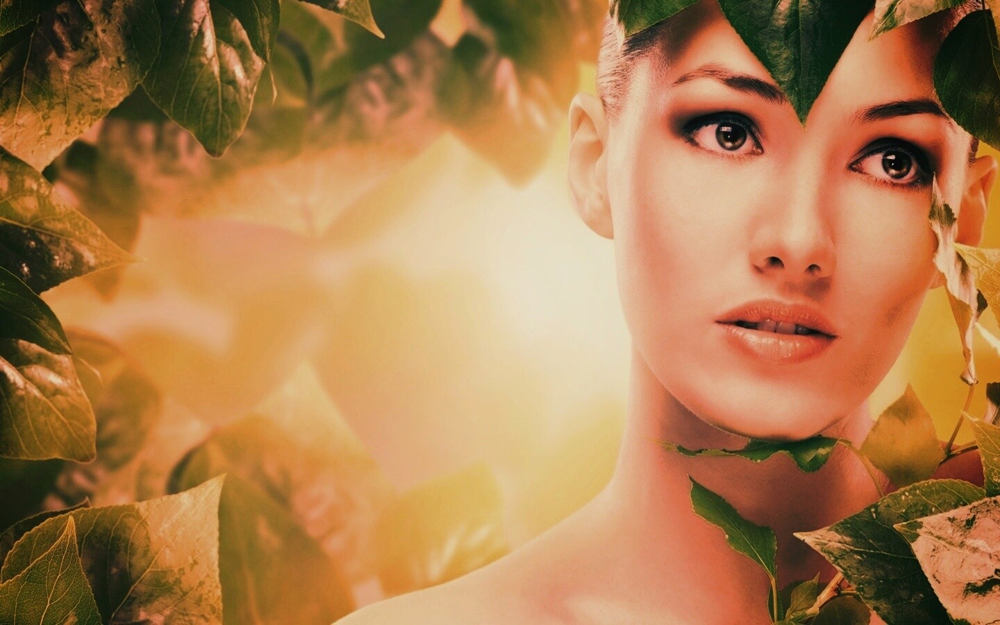Обои для рабочего стола «Девушка с зелеными листьями» 1440х900 с фильтром earlybird (оригинал 2560х1600)