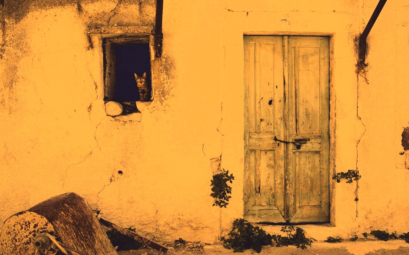 «Кот выглядывает из разрушенного дома»