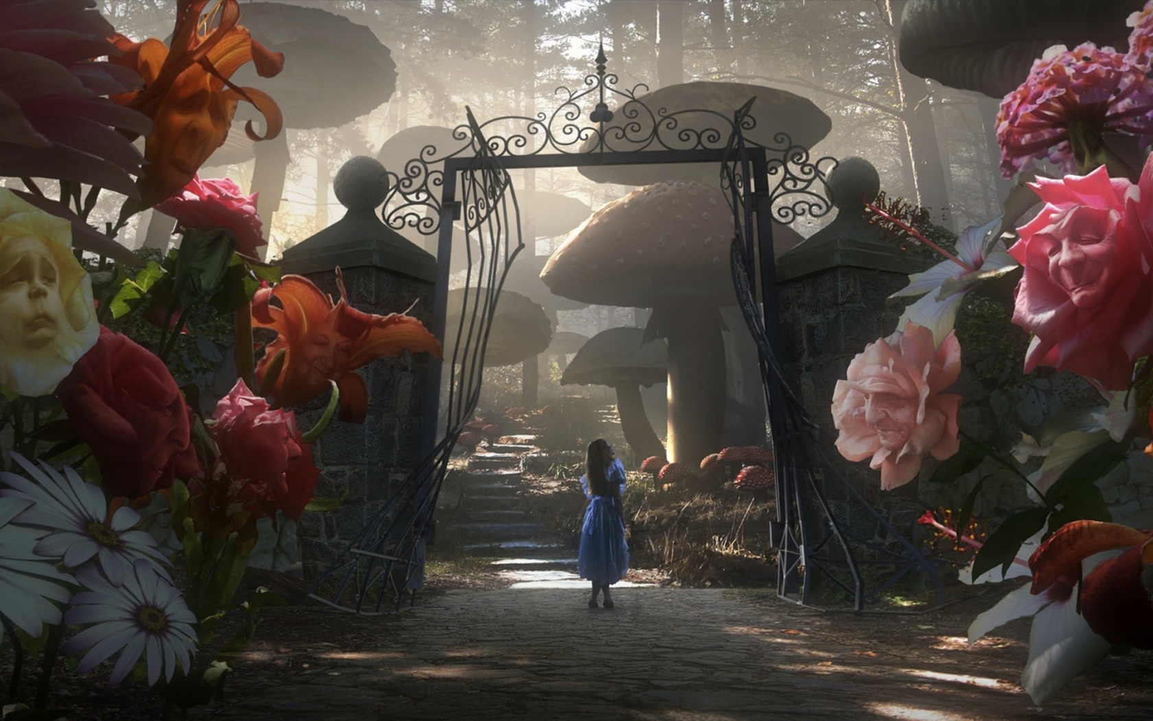 Обои для рабочего стола «Алиса в стране чудес среди живых цветов» 1680х1050 (оригинал 2560х1024)