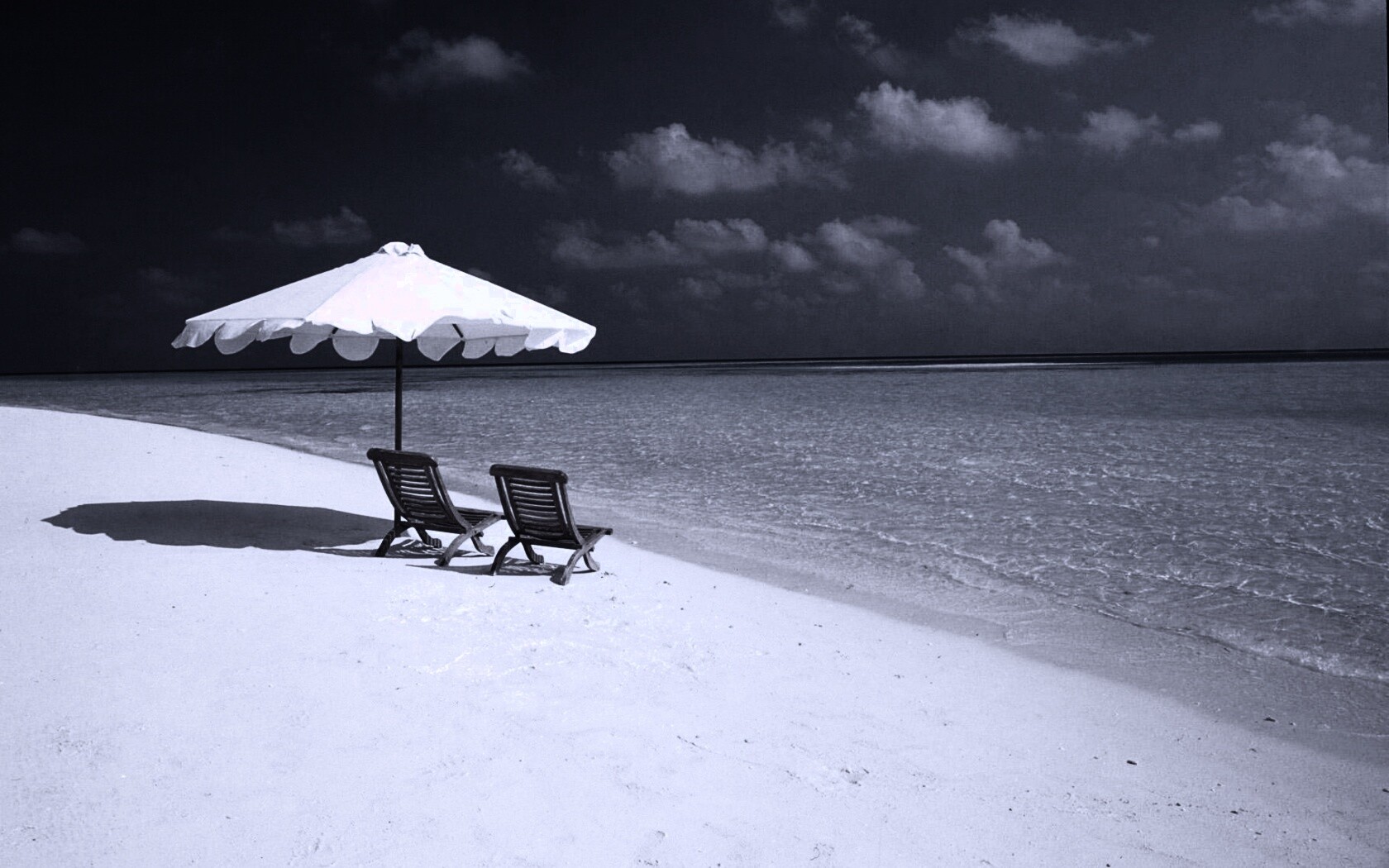 «Песчаный пляж с двумя жезлонгами»