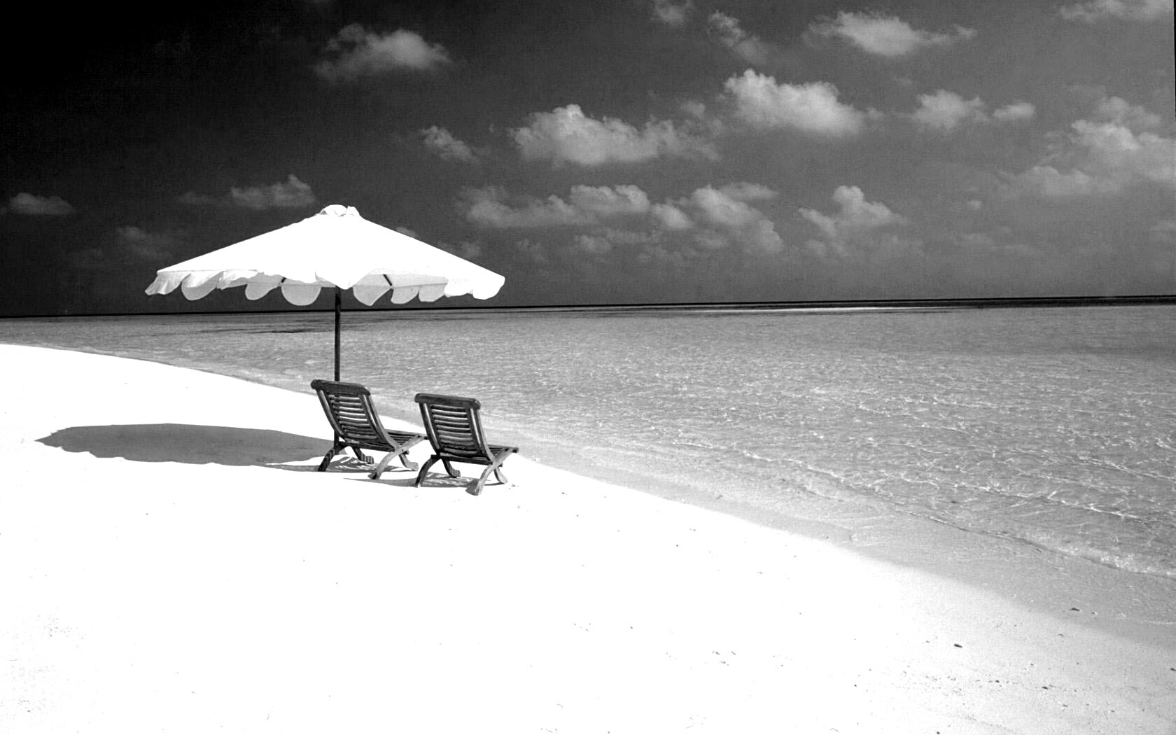 «Песчаный пляж с двумя жезлонгами»
