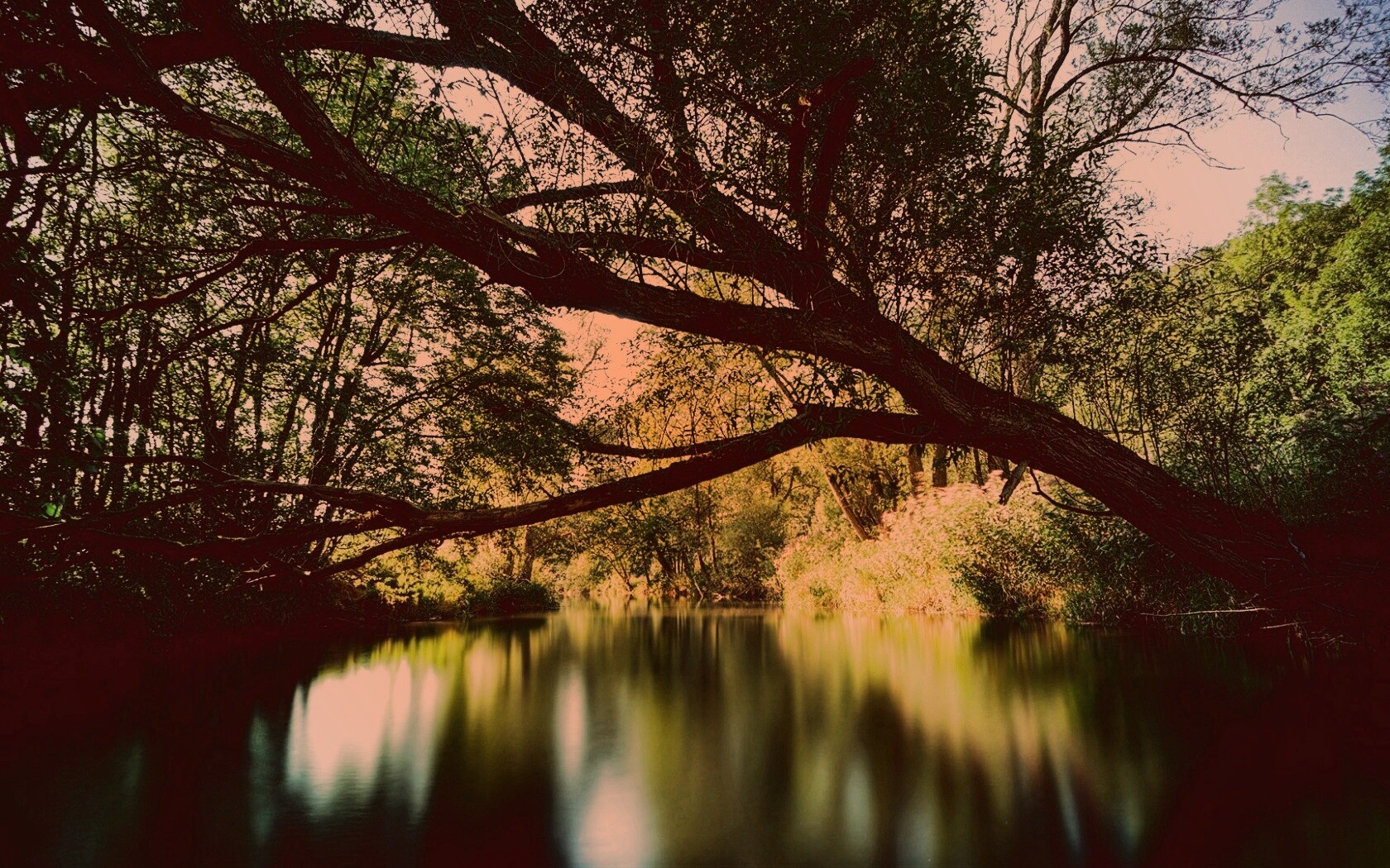 Обои для рабочего стола «Спокойная лесная река» 1680х1050 с фильтром toaster (оригинал 1920х1080)