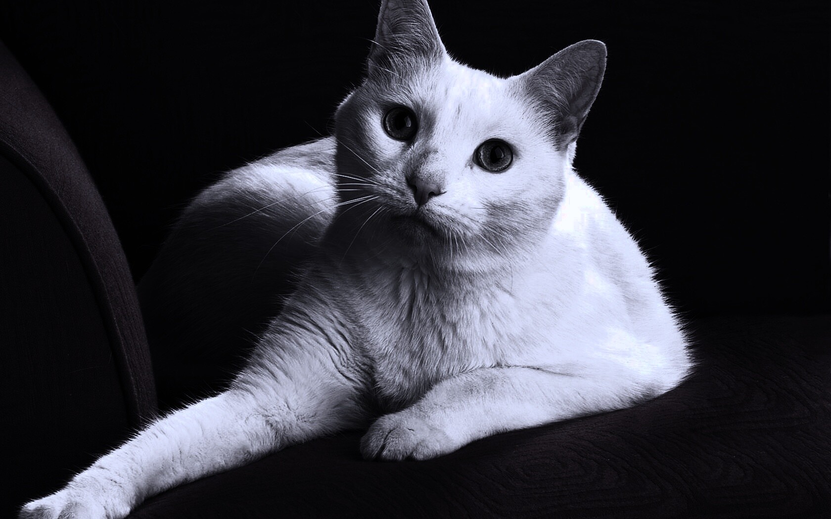 Обои для рабочего стола «Белой кот на красном диване» 1680х1050 с фильтром gotham (оригинал 1680х1050)