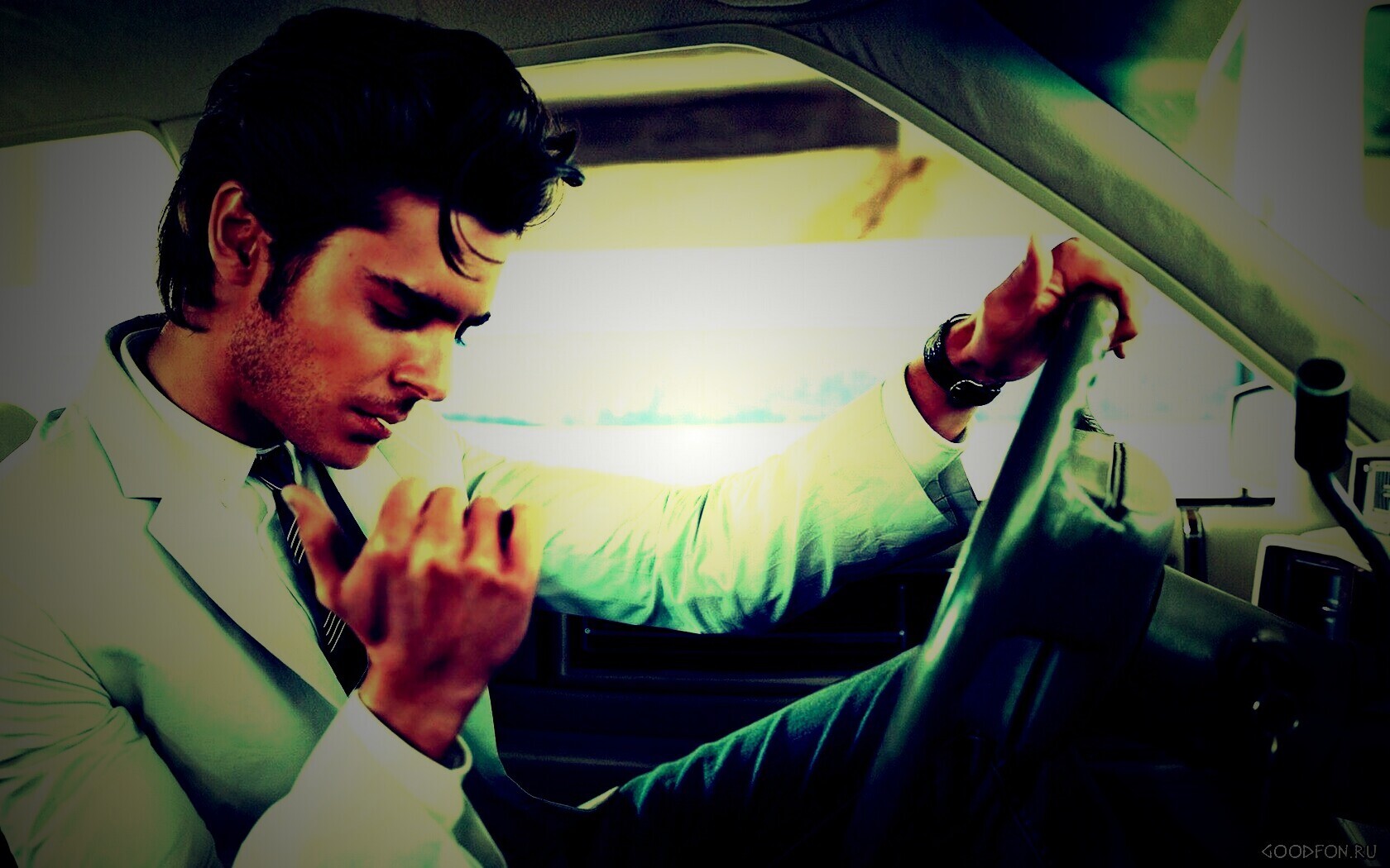 Обои для рабочего стола «Мужчина прикуривает в машине» 1680х1050 с фильтром lomo (оригинал 1680х1050)