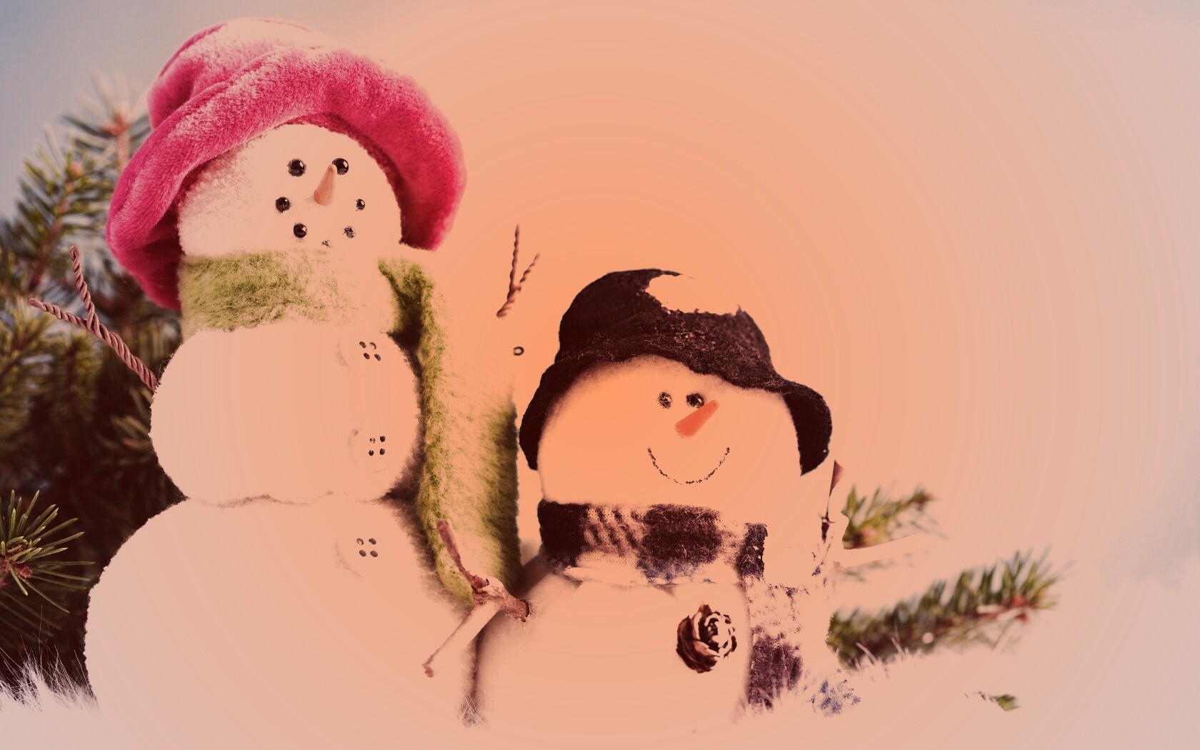 Обои для рабочего стола «Улыбчивые снеговики» 1680х1050 с фильтром toaster (оригинал 5616х3744)