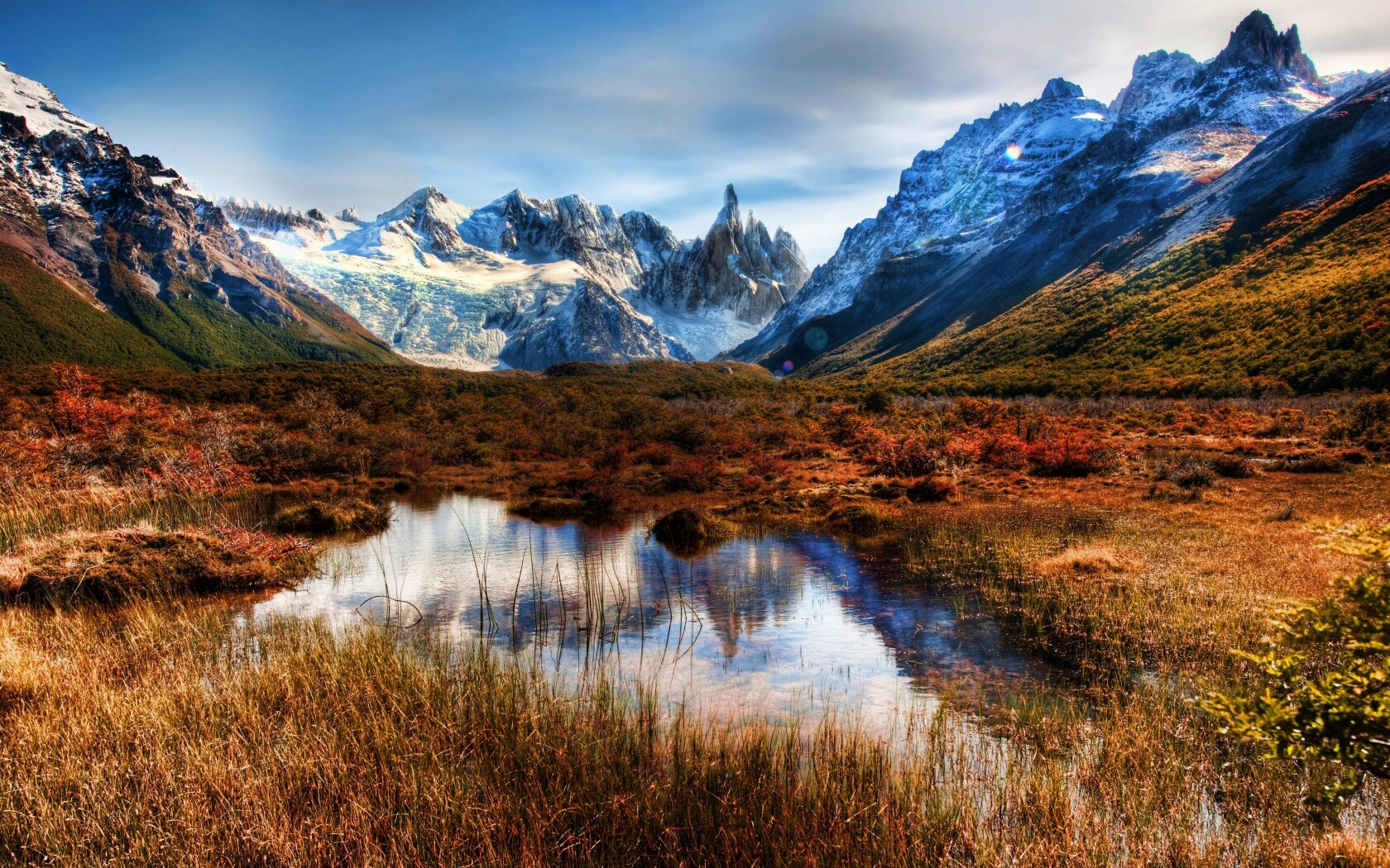 Обои для рабочего стола «Болота на фоне гор» 1680х1050 с фильтром vibrance (оригинал 4500х3008)