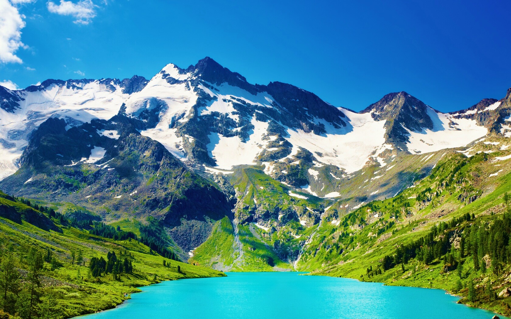 Обои для рабочего стола «Горное озеро» 1680х1050 с фильтром vibrance (оригинал 2560х1600)