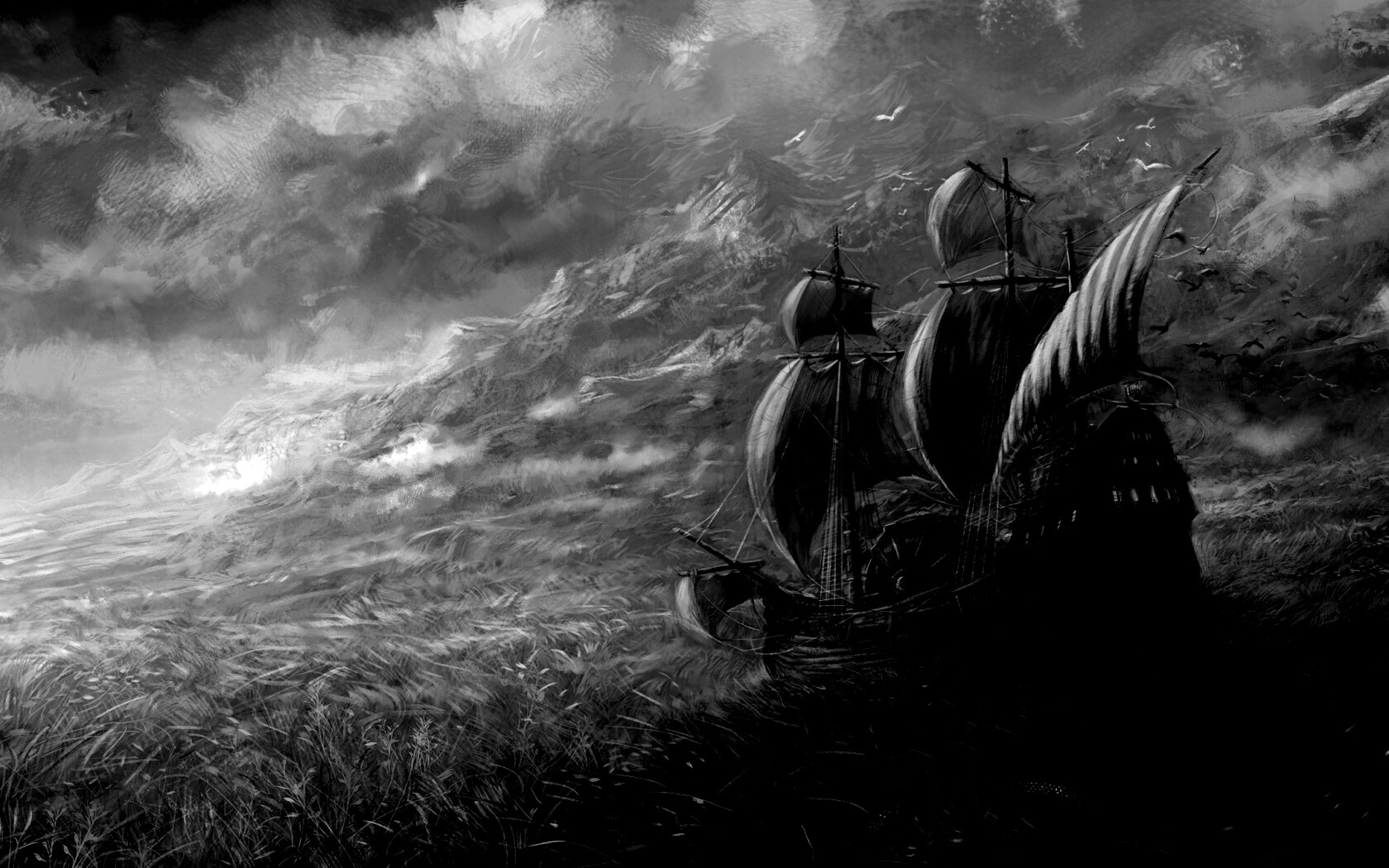 Обои для рабочего стола «Корабль в море травы» 1680х1050 с фильтром inkwell (оригинал 2993х1351)