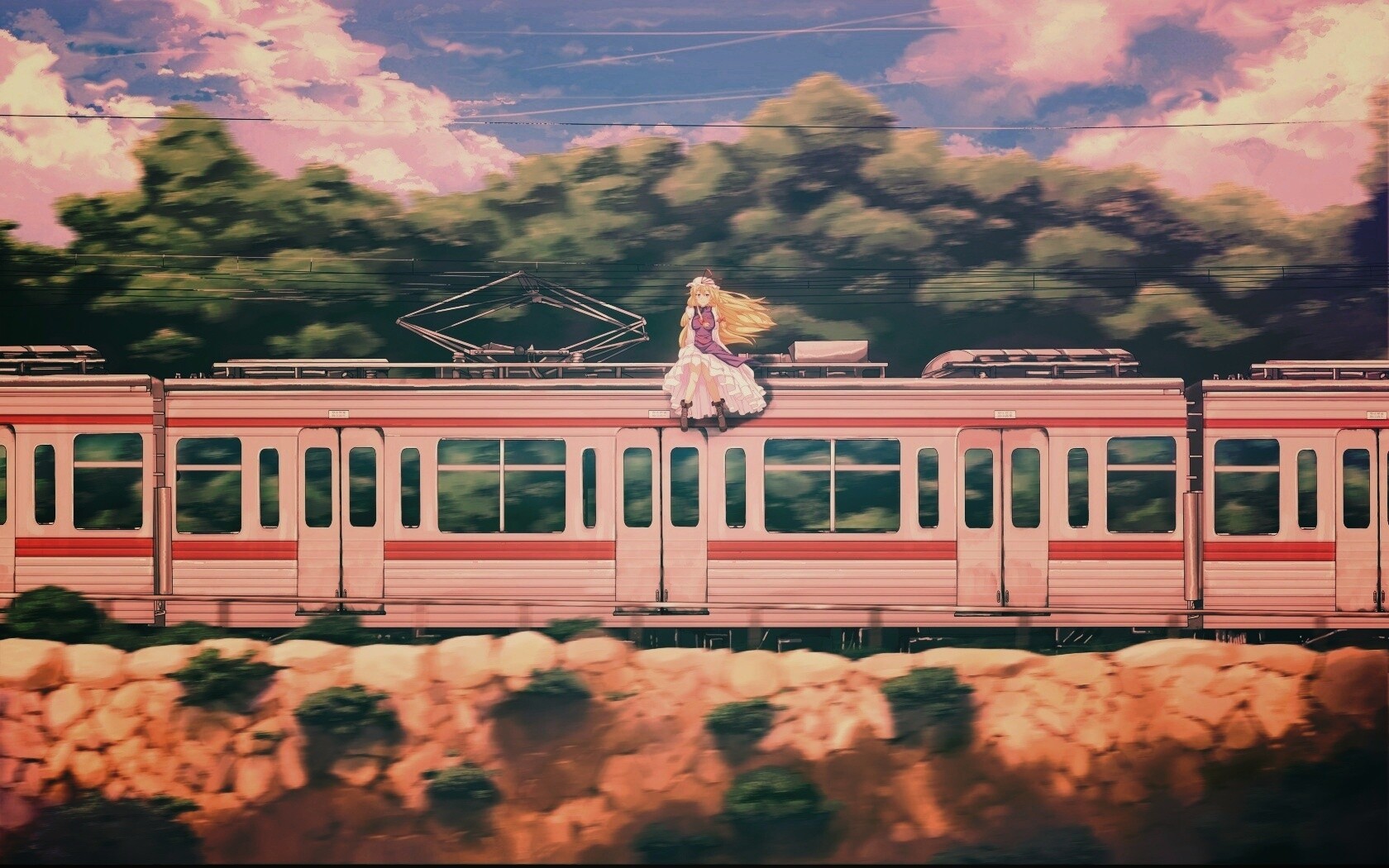 Обои для рабочего стола «Девушка на крыше поезда» 1680х1050 с фильтром earlybird (оригинал 3812х2760)