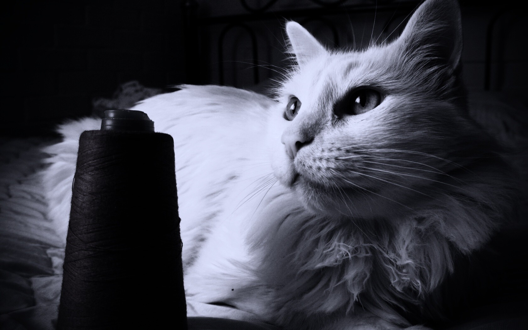 Обои для рабочего стола «Белый кот с катушкой ниток» 1680х1050 с фильтром gotham (оригинал 3648х2736)