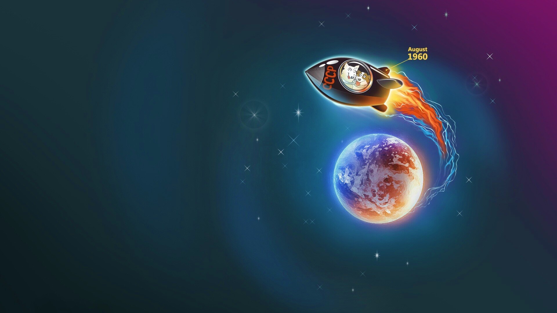 Обои для рабочего стола «Белка и Стрелка летят в космос» 1920х1080 с фильтром vibrance (оригинал 1920х1440)