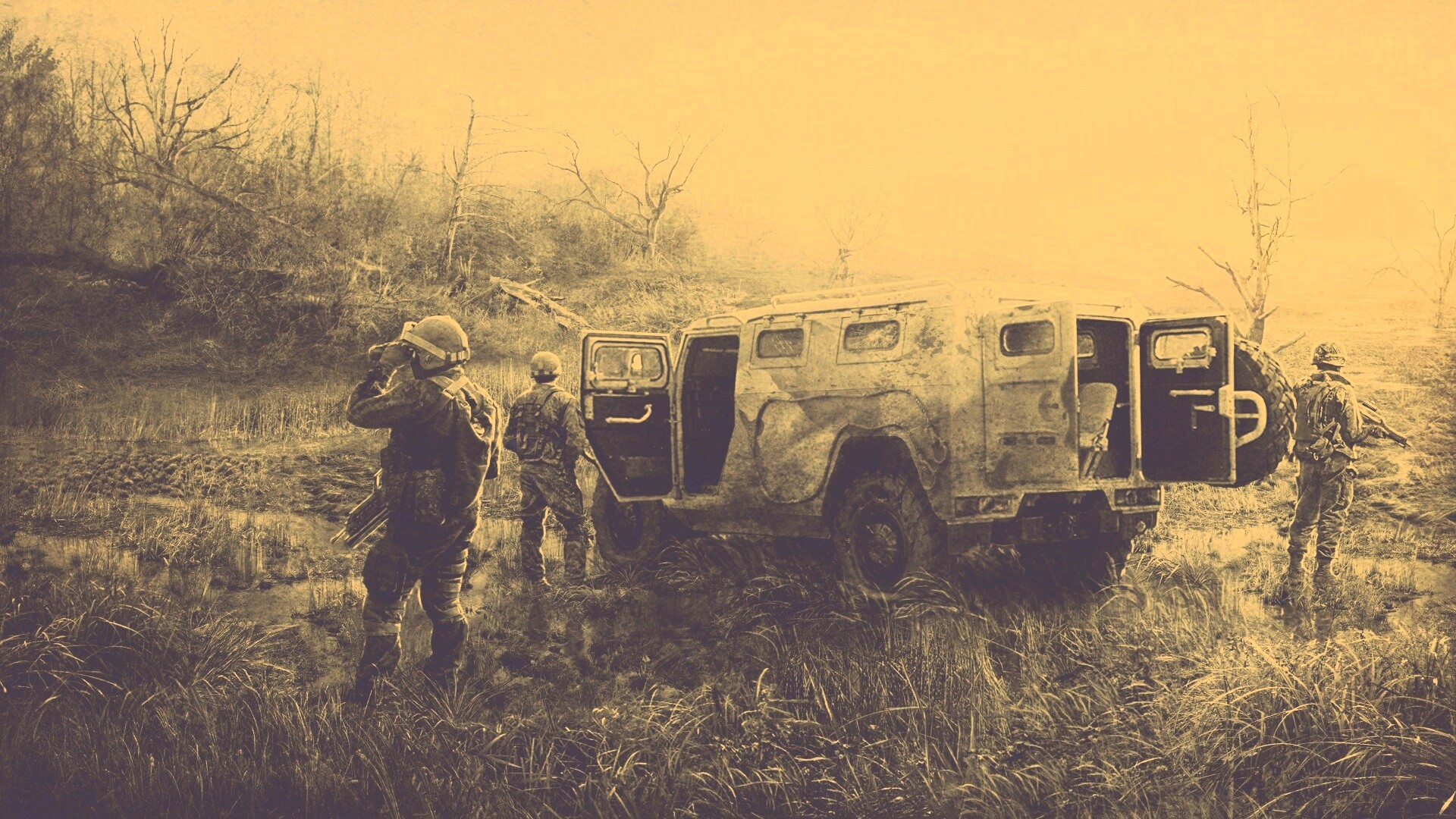 «Солдаты из сталкера на болоте»