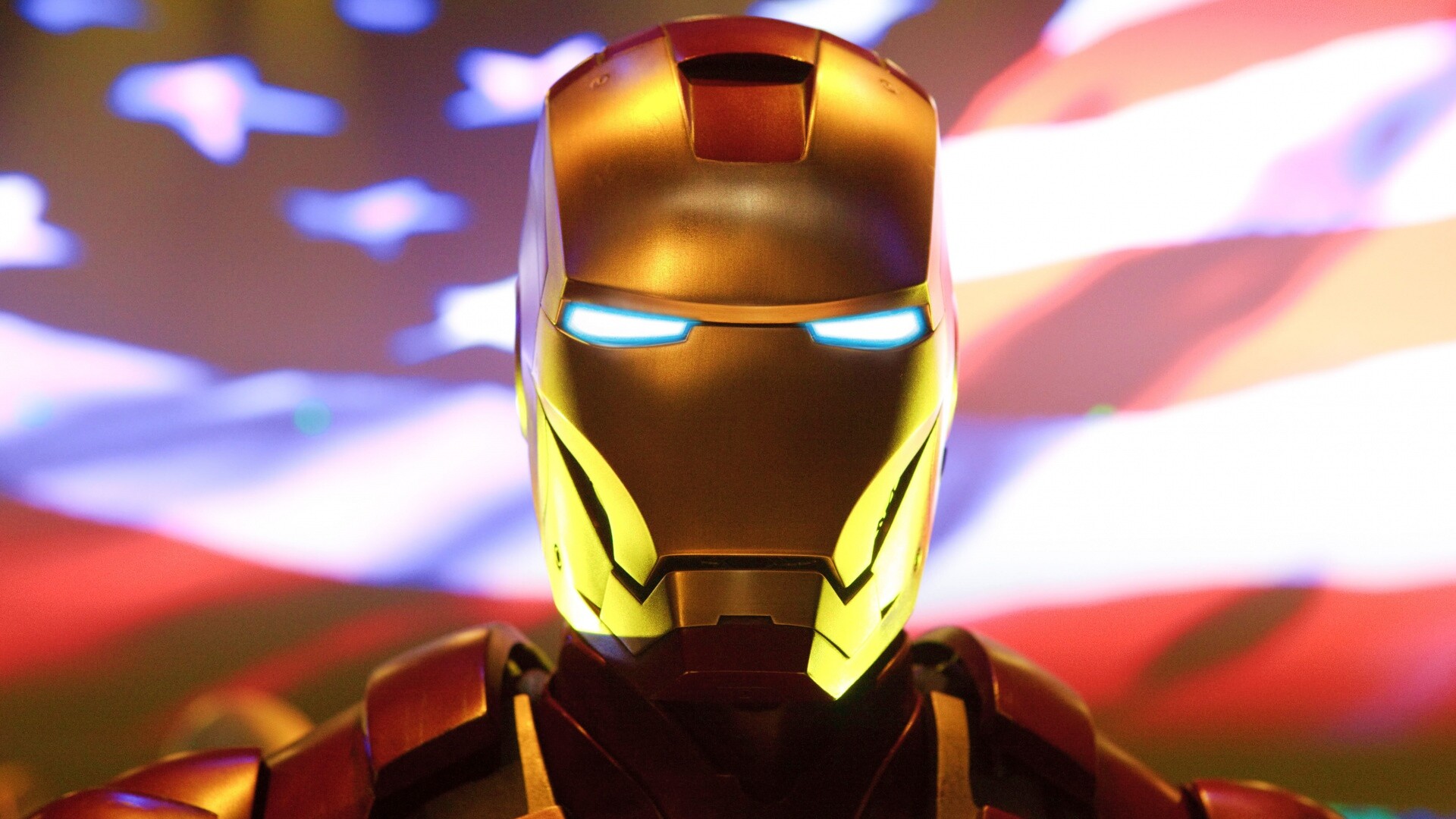 Обои для рабочего стола «Железный человек на фоне американского флага» 1920х1080 с фильтром vibrance (оригинал 3999х2666)