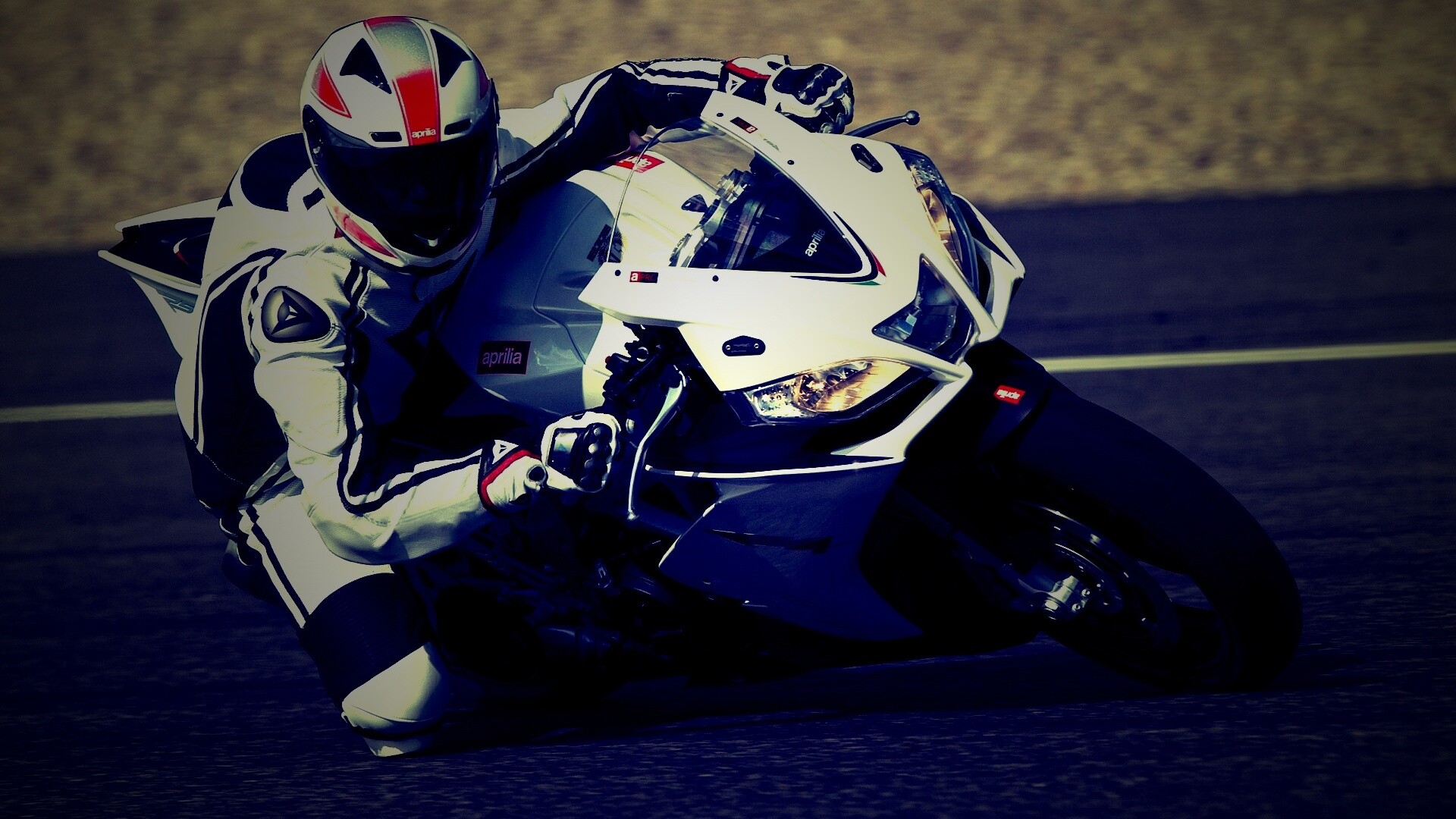 «Байкер в белой экиперовкена Априлия РСВ4»