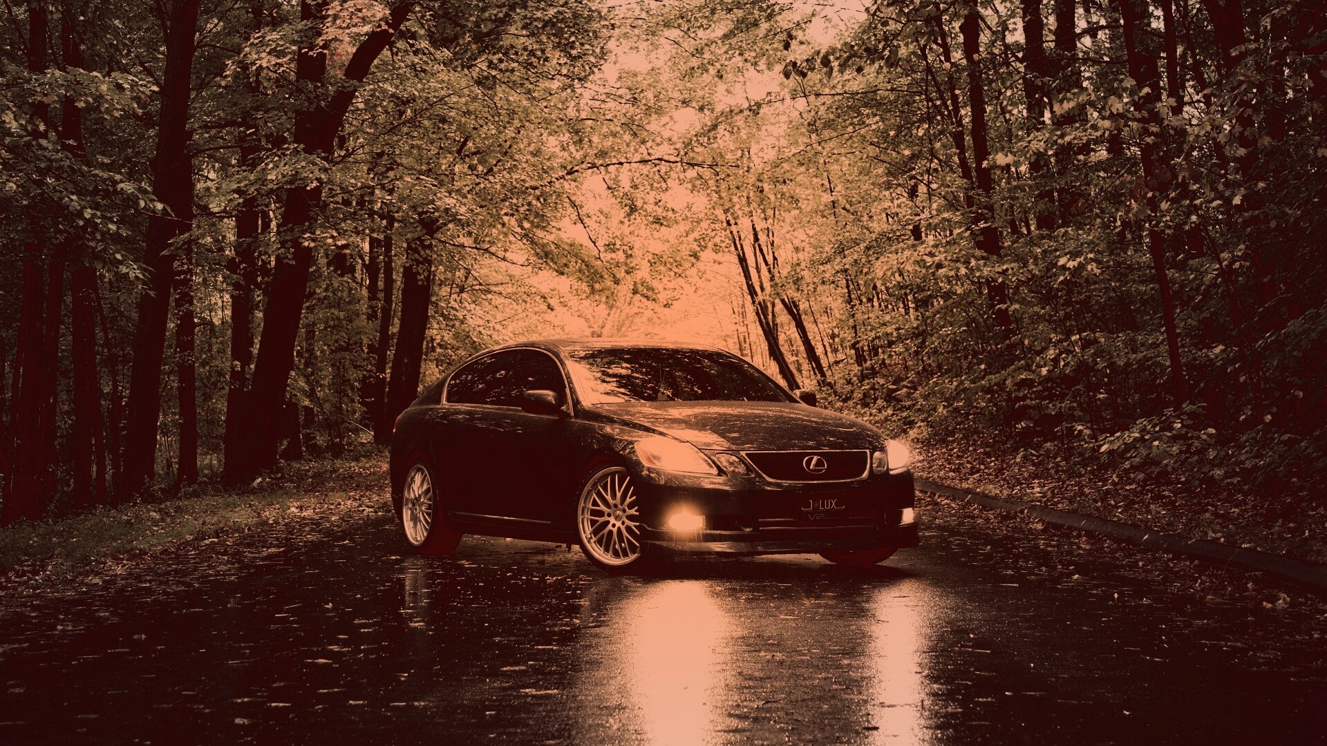 Обои для рабочего стола «Лексус на лесной дороге» 1920х1080 с фильтром toaster (оригинал 4909х3272)