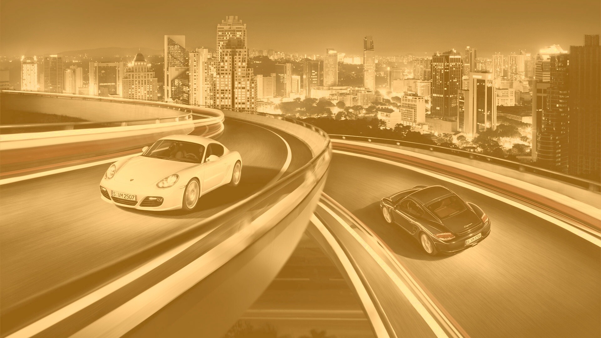 «Черный и белый Porsche на автомагистрале.»