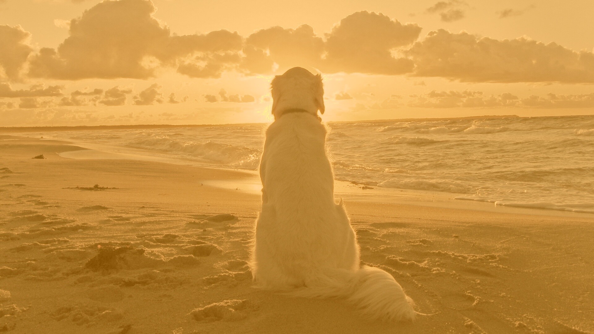 «Собака наблюдающая закат на пляже»