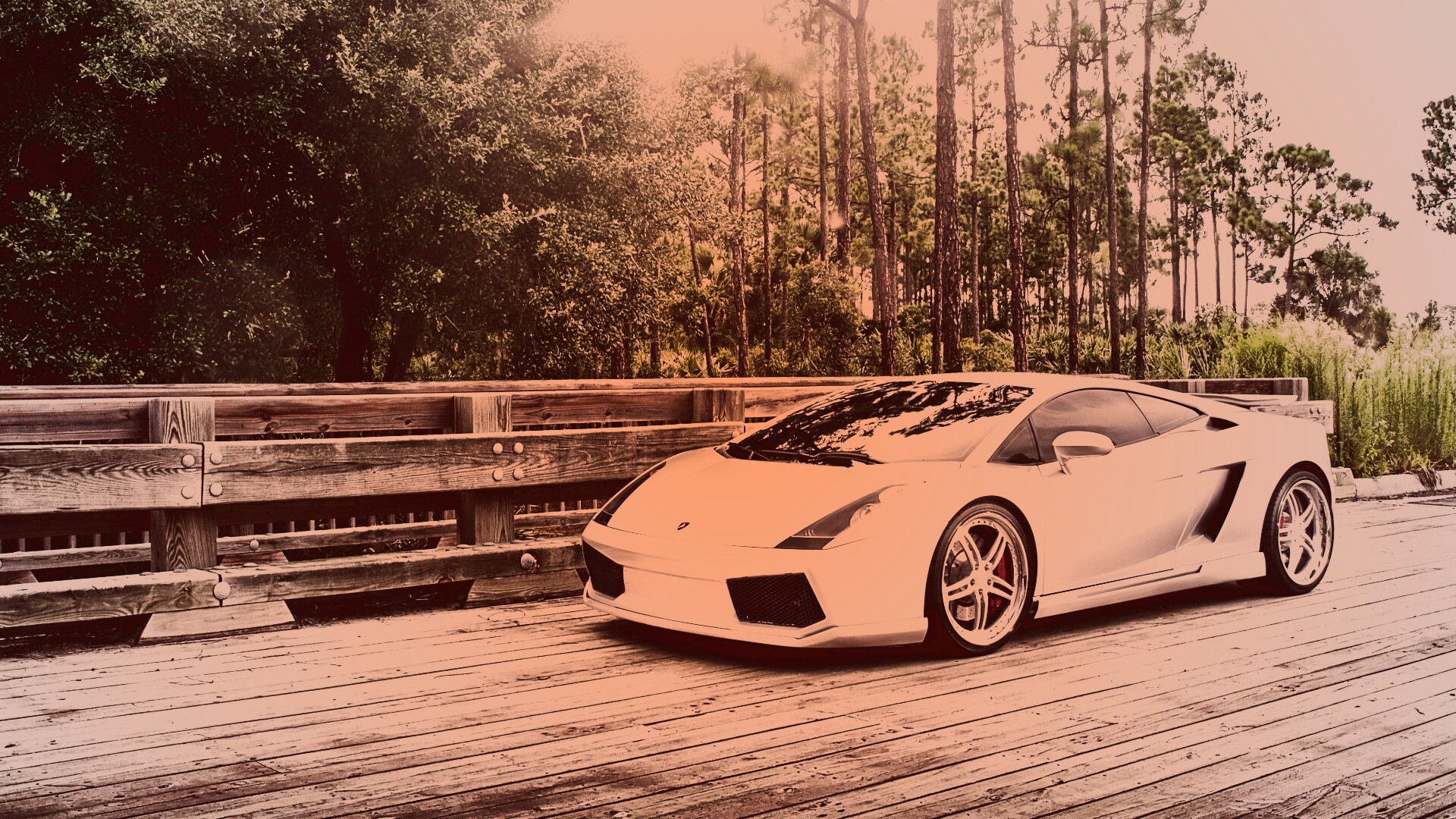 Обои для рабочего стола «Ламбоджини на мосту в лесу» 1920х1080 с фильтром toaster (оригинал 4064х2540)