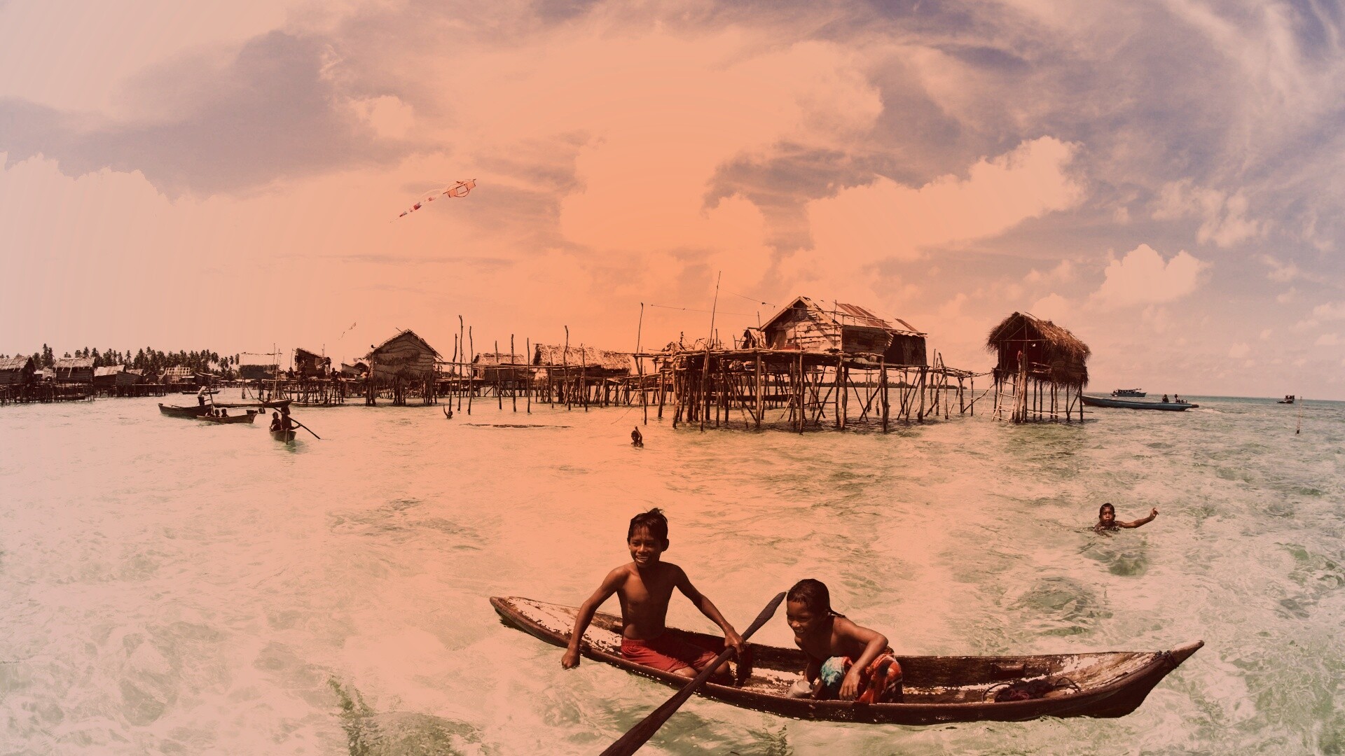 «Дети в лодке у поселения туземцев»
