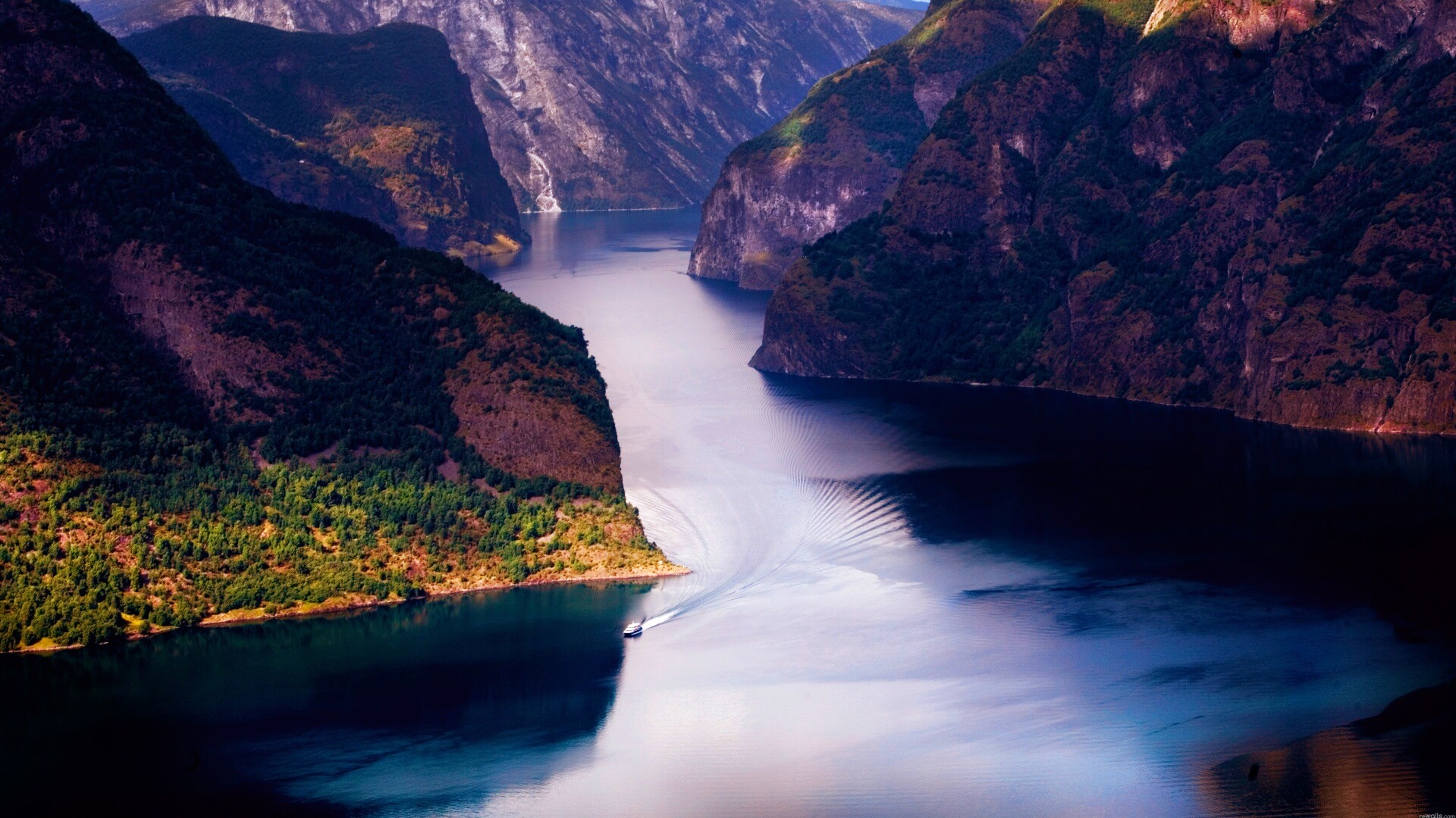 «Лодка на реке среди высоких гор»