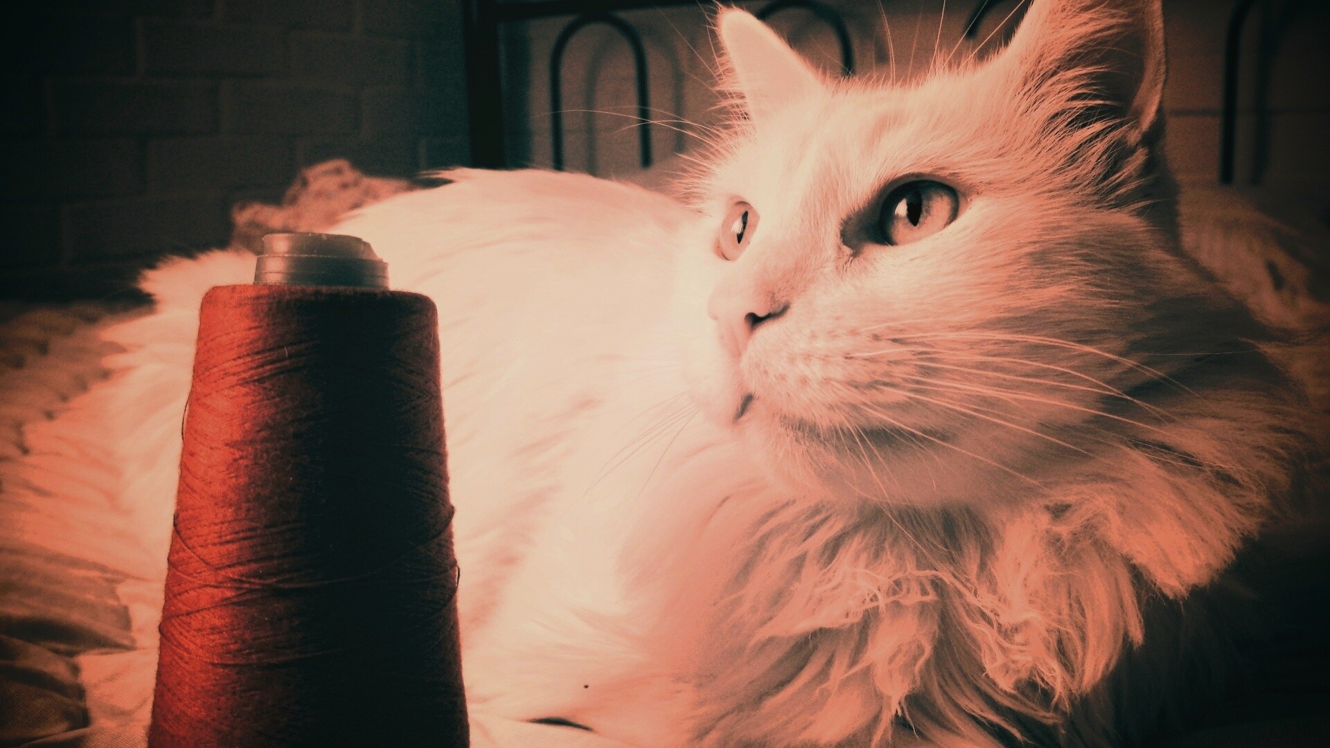 Обои для рабочего стола «Белый кот с катушкой ниток» 1920х1080 с фильтром earlybird (оригинал 3648х2736)