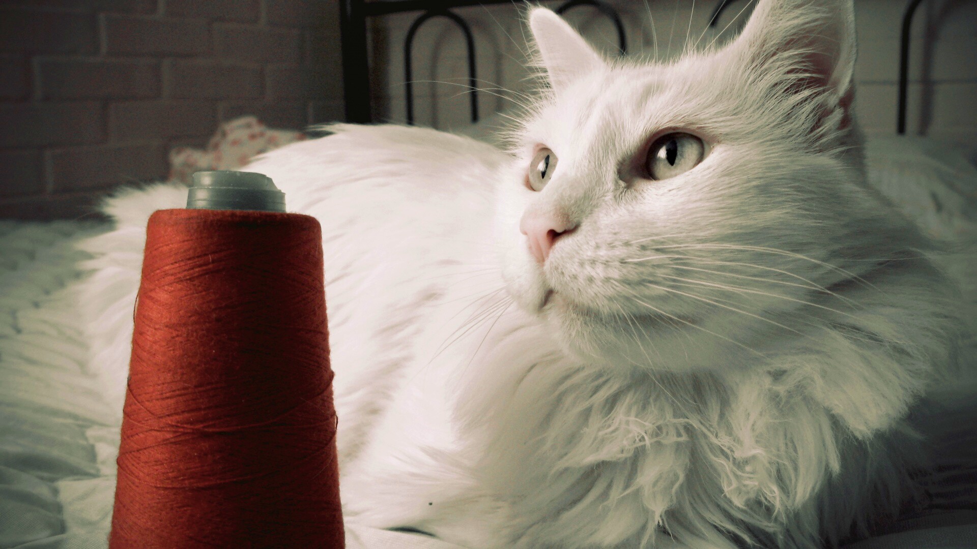 Обои для рабочего стола «Белый кот с катушкой ниток» 1920х1080 с фильтром vibrance (оригинал 3648х2736)