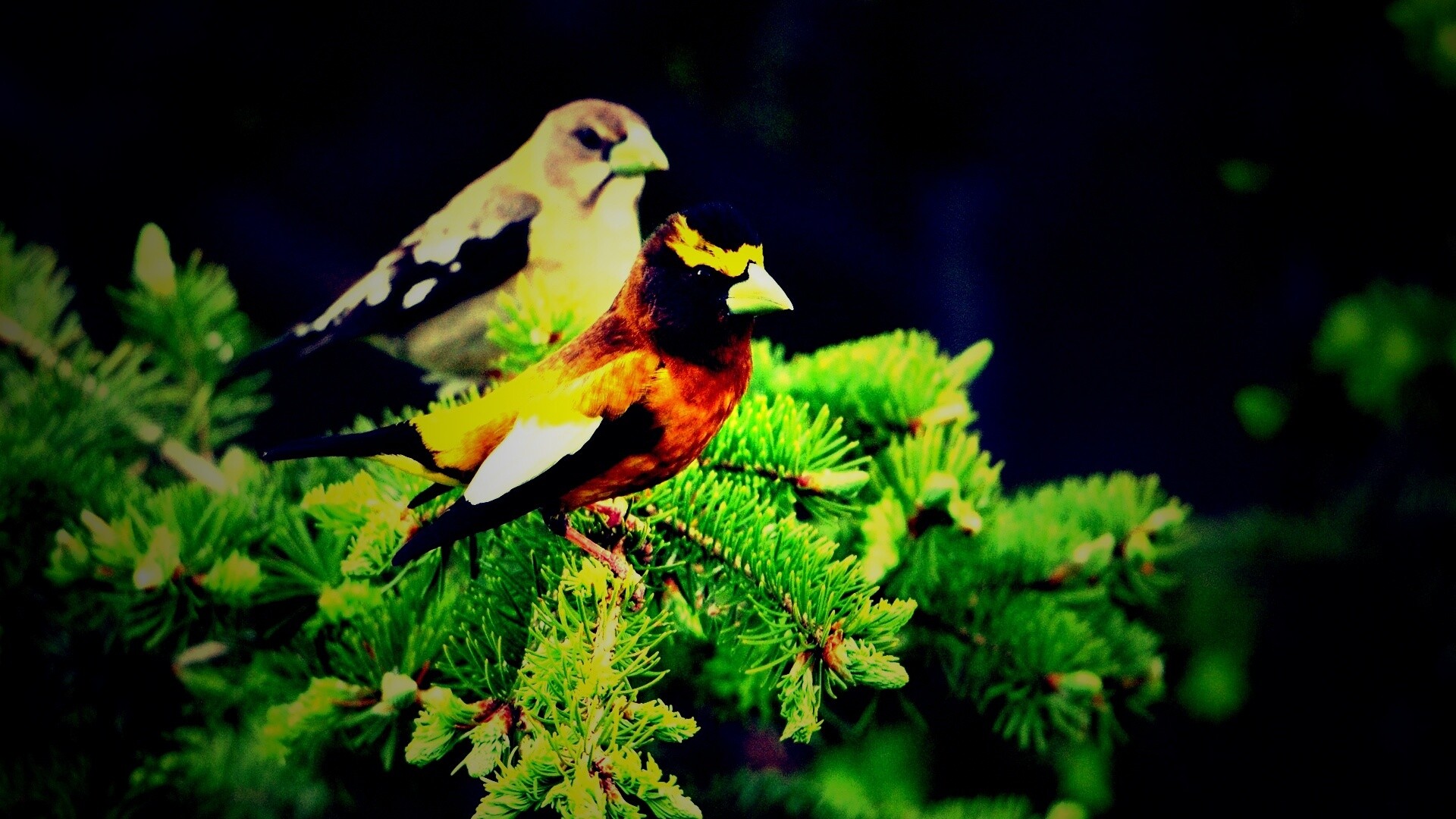 Обои для рабочего стола «Птички с зелёными клювами» 1920х1080 с фильтром lomo (оригинал 1920х1200)