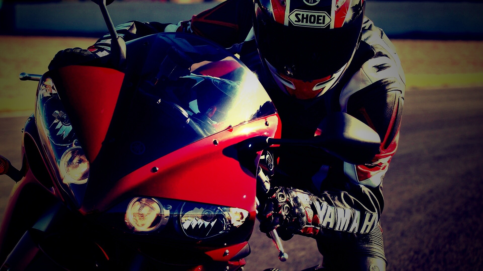 Обои для рабочего стола «Мотоциклист на красной ямахе» 1920х1080 с фильтром lomo (оригинал 1920х1200)